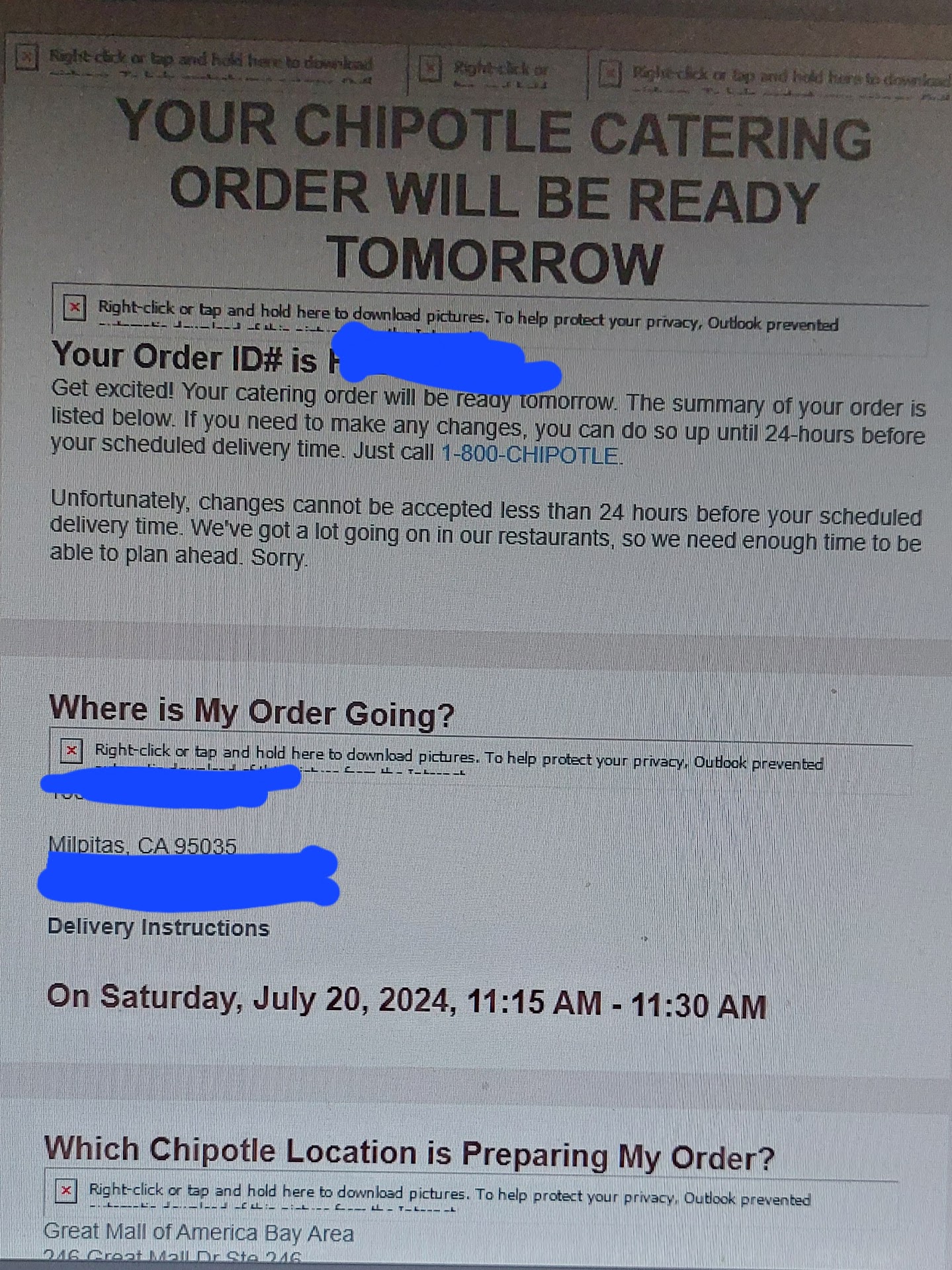 Read moreI wish there was a 0 star or 1/2 star option here. I usually do good reviews UNLESS the food or service was just horrible and that's what we have here. I made a catering order on 7/8/24 for an event for 7/20/24. I received several emails prior to my event confirming my order. On Friday 7/19 I received the last email from them saying "YOUR CHIPOTLE CATERING ORDER WILL BE READY TOMORROW". We requested for our food to be a delivered at 11:15am. It was 11:30am and nothing, so I decide to contact the store, well come to find that I CAN'T reach the store and I was able to speak to a catering person. She checks my order and tells me that they had a failed payment and my order was cancelled. I find it very odd that they would confirm my order several times but not tell me my payment didn't go through. (I used a company card by the way) The person I spoke with didn't have an answer for me and told me she would let their leadership team know. We depended on them to feed hungry people in a 90 degree weather. I waited for over 30 mins while she tried to call the store to see if they can get our order, but I would have to pick it up. After 30 mins I just hanged up and ordered pizza instead. I was not about to wait another 30 mins when I had kiddos to feed. This was my first and will be my last experience with them for any catering event. Don't depend on their emails confirming your order. My best advise is to follow up with them a day or 2 before your event if you decide to use them, to make sure there's nothing wrong...