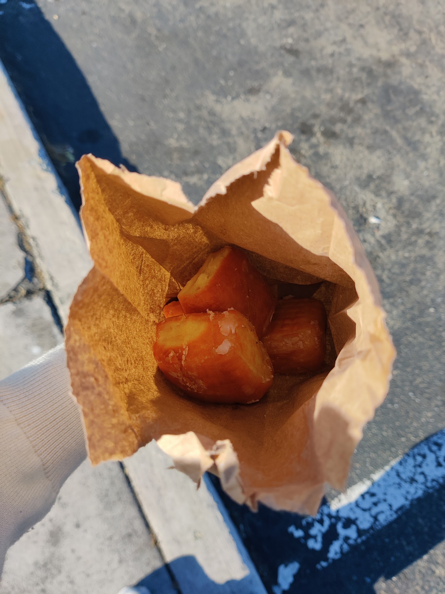 And both of us were SO glad we did. I didn't get the woman’s name (but I'm guessing she was the owner, so maybe she's Christy?), but she was SUPER nice. She was busy with another customer when we entered, so my uncle and I got a chance to look around. When he saw Kona blend coffee, he knew he'd found the right place. Kona blend is the "golden ticket" of coffee according to him. And we also noticed not just donut holes but FILLED donut holes! Seriously, neither of us had ever heard of FILLED holes before, and Christy's offers several fillings, including chocolate, raspberry, and cream. So we took some of the cream-filled ones and our coffee and went to sit out in our car.