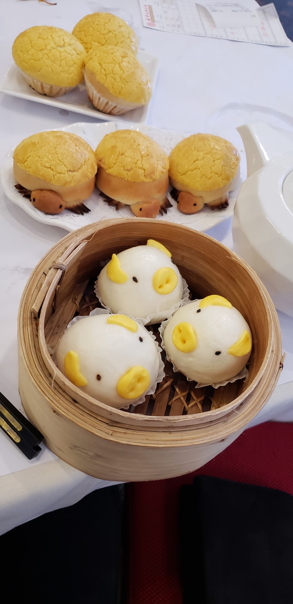 As you sit down they swarm your table with 3 or 4 carts of dimsum and goodies. We had the best meal, ordered too much, but loved it all. They come back to see if you'd like more from the carts. We forgot to even order from the menu. The staff were not pushy, they were so friendly and happy unlike other dimsum places in town. They get the idea when you dont want their suggested dish, just tell them no thank you when they bring a dish close to your table. Also they may not offer you a menu when you start ordering from the cart. Just Ask questions they are happy to help. Tea was not bitter and it was always filled. Egg custard buns are a must. Roasted pork and duck are super tasty. Good price for all we ordered. Cant wait to go back for the pigs and...