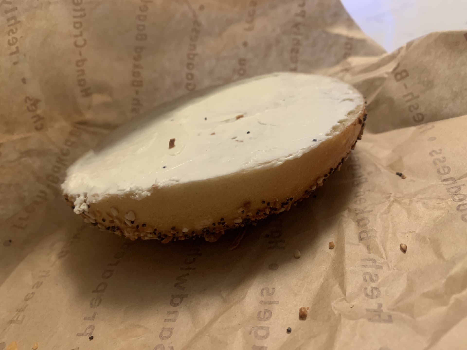 I didn’t worry much as I knew I wouldn’t be eating it right away mind you the had been open about 30 minutes when I arrived Makes me wonder if the eggs were prepared this morning The cream cheese smear is my biggest complaint