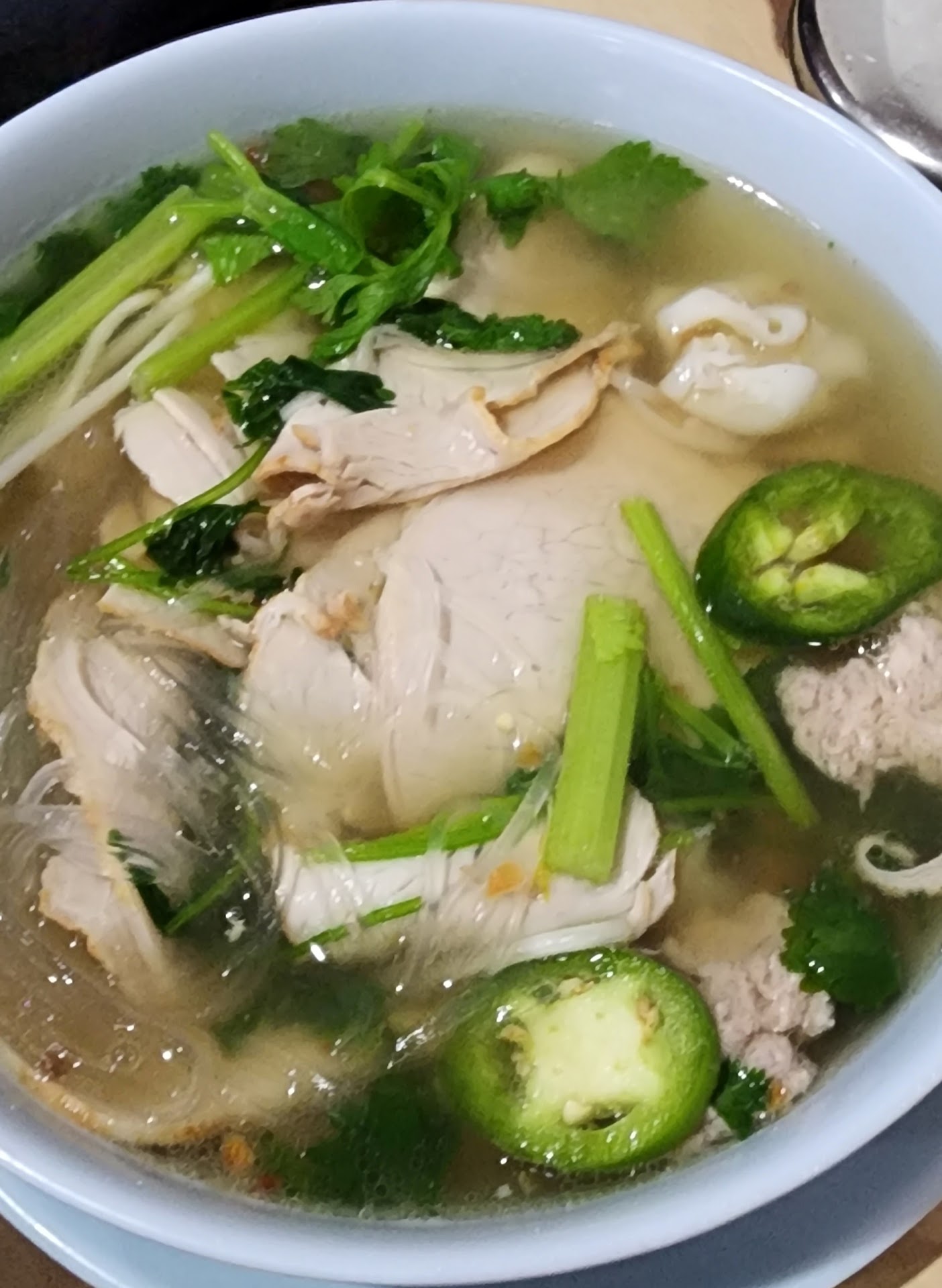 I also ordered an add-on of pig blood with my young chicken pho, but it wasn’t as silky smooth as I’m used to, so I wouldn’t recommend it. The chicken pho was fairly average, though it was unique to find chicken served on the bone in the USA. The usual wrap with vermicelli, shrimp, and bean sprouts, paired with individual peanut sauce for dipping, was refreshing. Overall, we spent around $30 per...