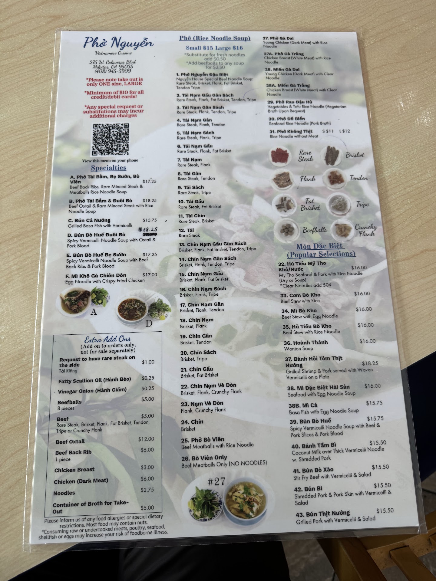Read moreWe sometimes eat here for convenience. Today was for dinner. I ordered the Pho Tai Sach, which had been my usual pho order at all pho restaurants. Their pho has been usually a tad on the sweeter side for us but with generous meat and sach. Overall, 3.5/5. The Hu Tieu soup was decent and good, nothing special but they did provide 2 quail eggs and more meat vs othe places, 3.5/5. Spring rolls, decent and average (seems to have gotten shorter), nothing special or wow. The peanut sauce was ok, 3/5. Our server was impatient and didn't listen well to our order this time. Customer service was made much better by the owner's son, which he usually provided great...