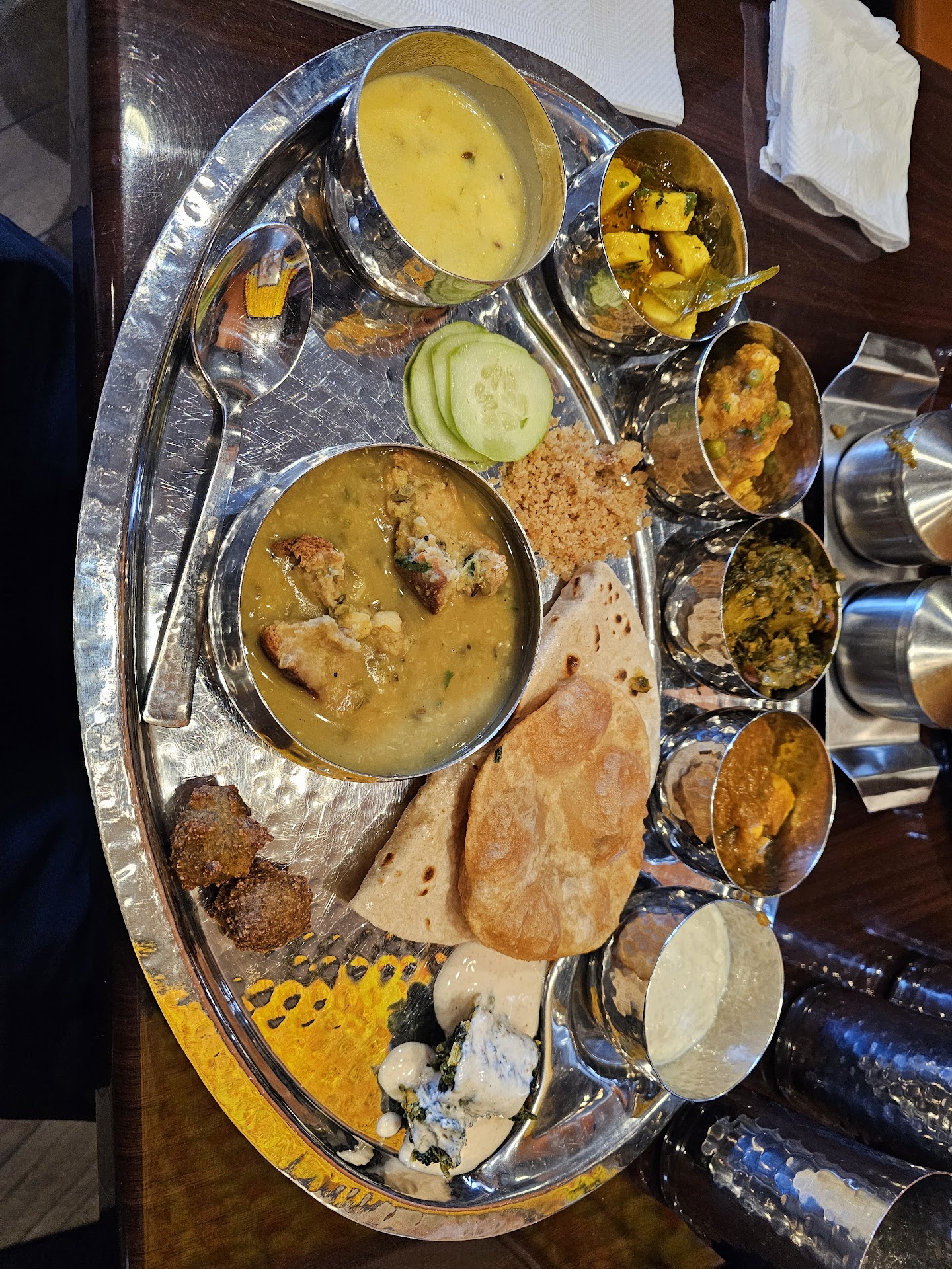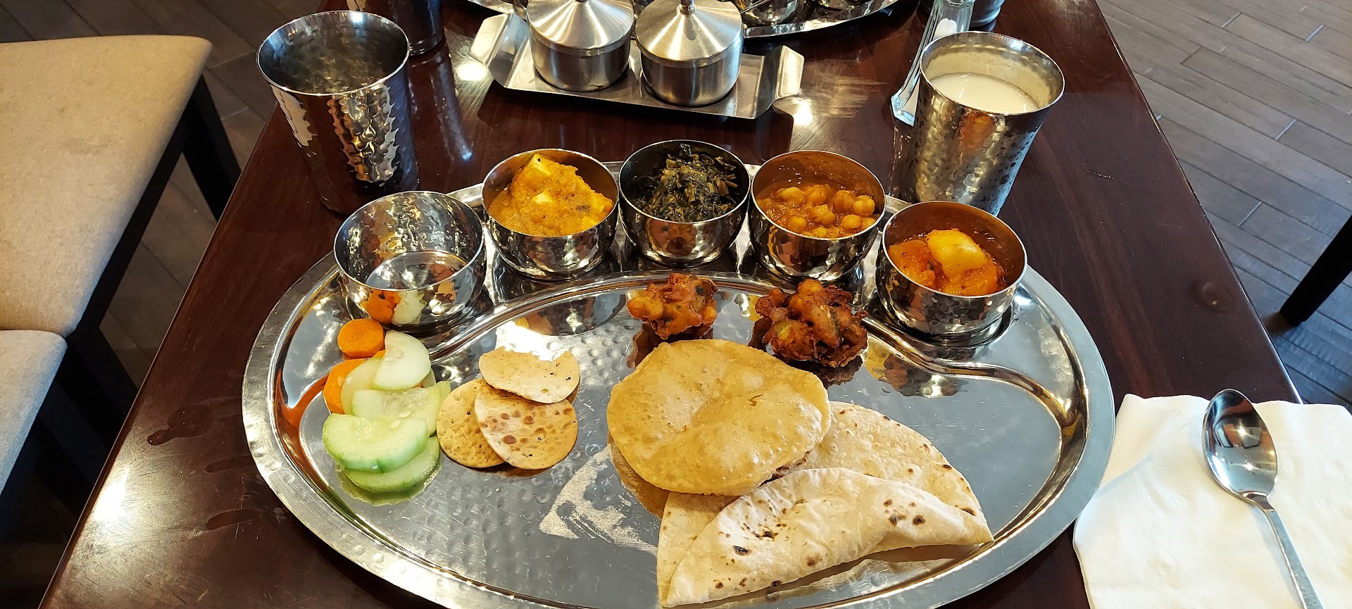 I am very impressed with the food and service. The vegetarian thali came with a variety of dishes, including dal makhani, chana masala, paneer sabzi etc. The food was all delicious, and I especially enjoyed the dal makhani and kadhi pakora. The dal makhani was creamy and flavorful. It was great to enjoy the fresh and warm pakoda and pooris.