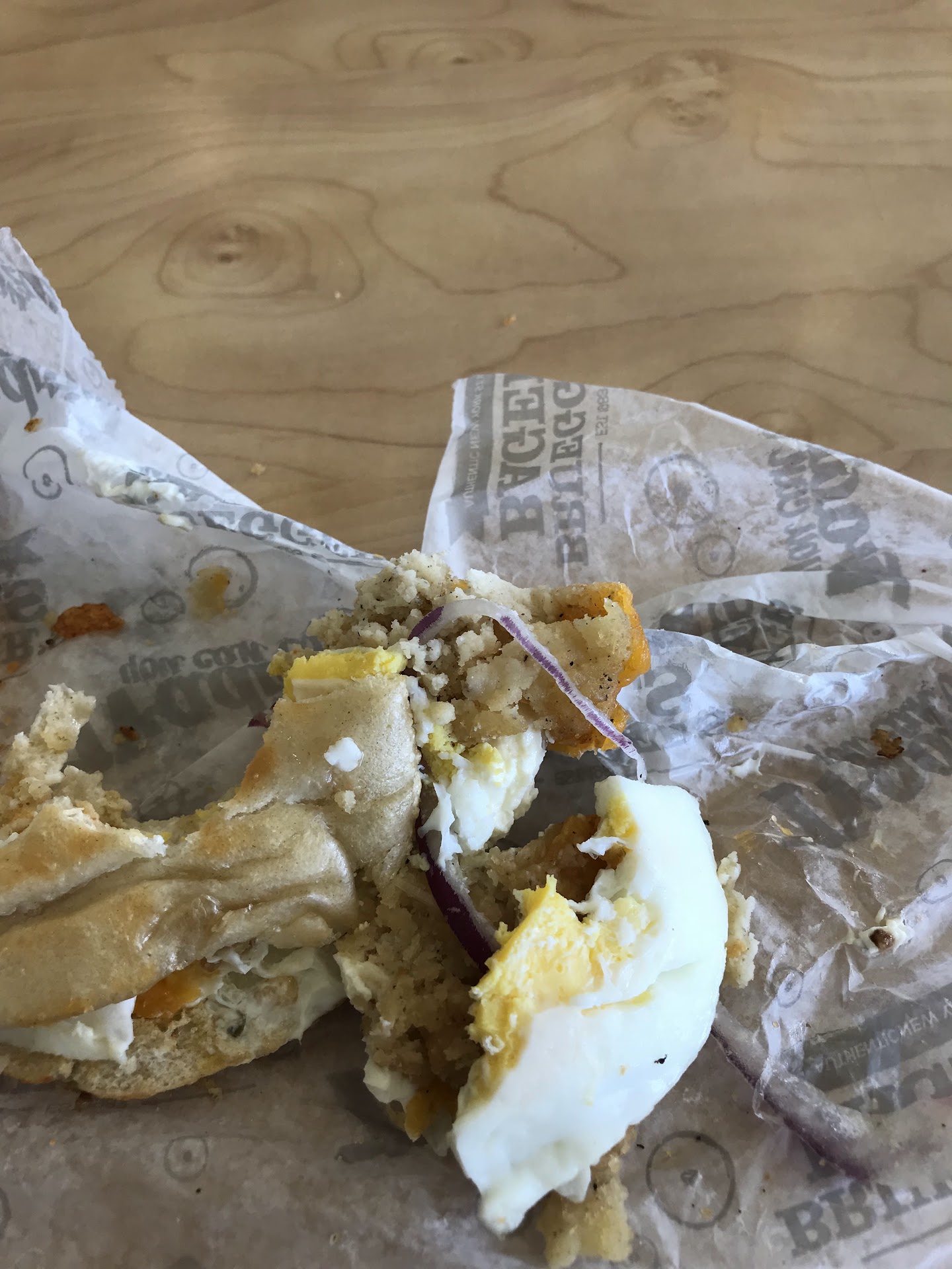 Read moreI hadn't been to a Bruegger's Bagels in some years and wow did this brand go downhill. To start, this location is downright uninviting. The door has a piece of paper taped to the entrance letting customers know they're no longer welcome to eat inside. Yes there is plenty of open space, but they've removed all of the furniture except a few pieces labeled "employee rest area", or something to that effect. Alright great, I'm forced to eat in my car because they can't be bothered to deal with real patrons and would rather act like they run a ghost kitchen. Next, my wife and I were both asked for our orders at the same time. That's fine if the person making the sandwiches can keep it straight, otherwise since there's nobody else in line, take your time and ask us as you make them, or at least double-check if you're unsure. The cream cheese my wife ordered was put on my sandwich and vice-versa. Not a big deal, and normally it wouldn't bother me at all, but everything about coming to this place was such a poor experience that it does. A few seconds after giving our order, we go to pay and the cashier asks "what did you get?", okay you're asking me instead of talking to your coworker 5ft to your right, or listening to the order I just gave; nothing else was going on, but sure. "I ordered Sandwich A and Sandwich B and a coffee" - "That'll be $37" - How??? Somehow my order was interpreted as 3 sandwiches. Okay, mistakes happen, but it's just one thing after another. Now the checkout asks for a tip and it's irksome. Feels like a derelict business shaking down anyone still willing to come through the doors while offering as little hospitality and service...