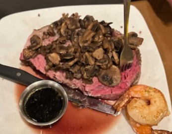 The Wife and I visited on a Monday at 7:30 in the evening. We took a seat at the bar and ordered a Shirley Temple for the Wife and a Brandy Old fashioned sweet for myself. Cocktail was delicious so I had to have twoš Asked the bartender if she could switch the TV channel to the ballgame since the bar was mostly empty and she gladly did. The bartender offered us the opportunity to enjoy our evening dinner at the bar so we gladly accepted. The dinning room was about 1/4 full when we arrived towards the end of the dinner rush on a Monday. We asked the bartender for a recommendation off the appetizer menu and she recommended the homemade deep fried mushrooms or cheese curds. So we had both! Turned out to be an excellent choice. They offer prime rib daily, so that's a bonus! I ordered the Emperor cut, medium rare with sauteed onions and mushrooms with a side of horseradish. ( Coarse or creamy) my choice of sides was the veggies and a cup of baked french onion soup. The soup arrived piping hot with a thick layer of perfectly browned cheese. The prime rib was placed in front of me a few minutes after I finished the French onion. Now this is a mountain of meat (24oz) that reminded me of Devil's Tower! An excellent added touch was the bowl of au jus that came with it. Not a little bowl or plastic cup that overflows everytime you drunk a chunk, but a big bowl! The meat was warm and tender with a nice little ring of seasoned fat wrapped around. The Wife's dish was the stuffed shrimp which she said was good. I was to busy with that tower of perfection to try any of the Wife's meal. We'll definitely be...