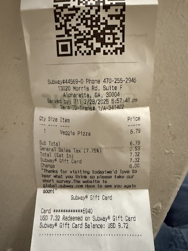 Read moreI had gave a poor rating to the Subway Sandwich Shop located at 131 South Main Street, Suite A, Alpharetta Georgia, but I received a message from the Franchise owner of a Subway Shop located elsewhere. Don't understand how that happened, but the ONLY Subway Shop I use is that one that is located at 131 S. Main Street. Not Morris Road, I don't even know where Morris Road is located. So to recap again, the Shop I DO NOT RECOMMEND IS 131 S. Main Street, Suite A, Alpharetta, Georgia. I read some other reports, and obviously I am not the only person that has been screwed over by...