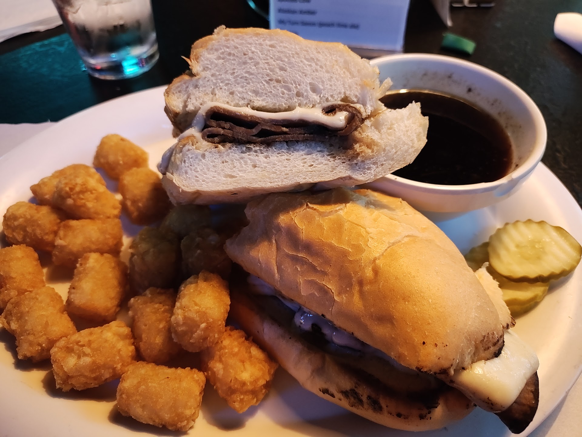 The food was standard bar fare, nothing fancy or special. Don't get me wrong it certainly wasn't bad. I ordered the French Dip and the au jus was a very tasty accompaniment. There could have been more actual roast beef on the sandwich, but it was still good. And they have tater tots. I know it seems like such a small thing, but sometimes I just don't want my potatoes in fry format. Everyone ordered different things and no one had any criticisms, but also no raves either. Standard fare for a casual night out in a...