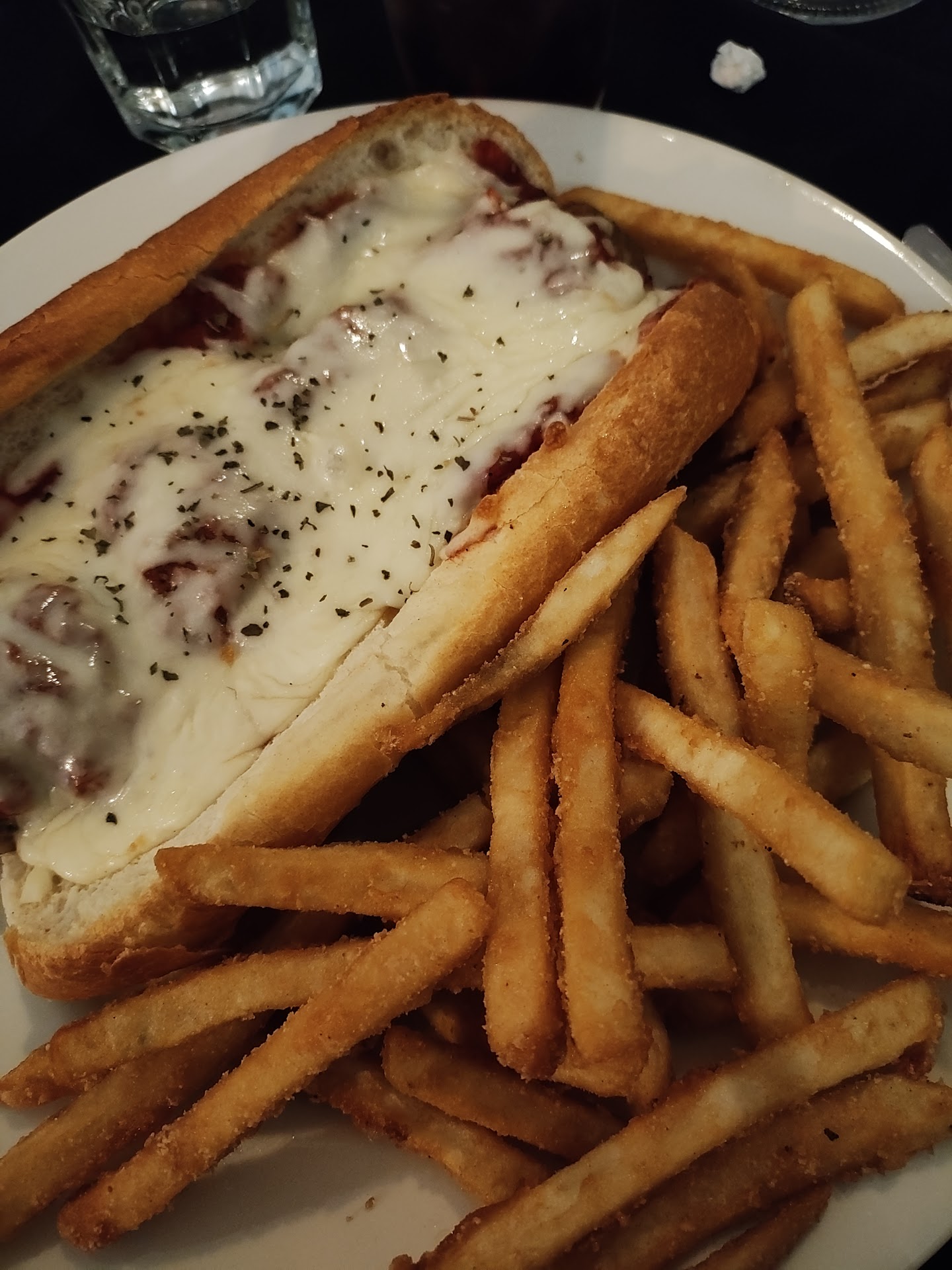 The food is a mixed bag. I can't remember what everyone ordered, but I do remember the only complaint from someone other than me was that she didn't like tomato sauce. Not THEIR sauce, just tomato sauce in general. So she was complaining about herself having ordered it. I had not had a Meatball Sandwich a few decades so I decided to give theirs a try and did the add-on of Fries and Coleslaw. I received the fries, but no slaw. When I asked about it I was told they were out. No one said anything about this when the order was placed nor when the food was brought out, and it was not removed from the check. The meatballs were flat. No flavor at all. The sauce was flavored of course, but the lack of flavor in the meatballs themselves brought the entire sandwich down. The Mozzarella Sticks are outstanding. They are large, gooey on the inside, with an ultra crunchy breading that you want to have in a mozz stick. I would go back for just those.