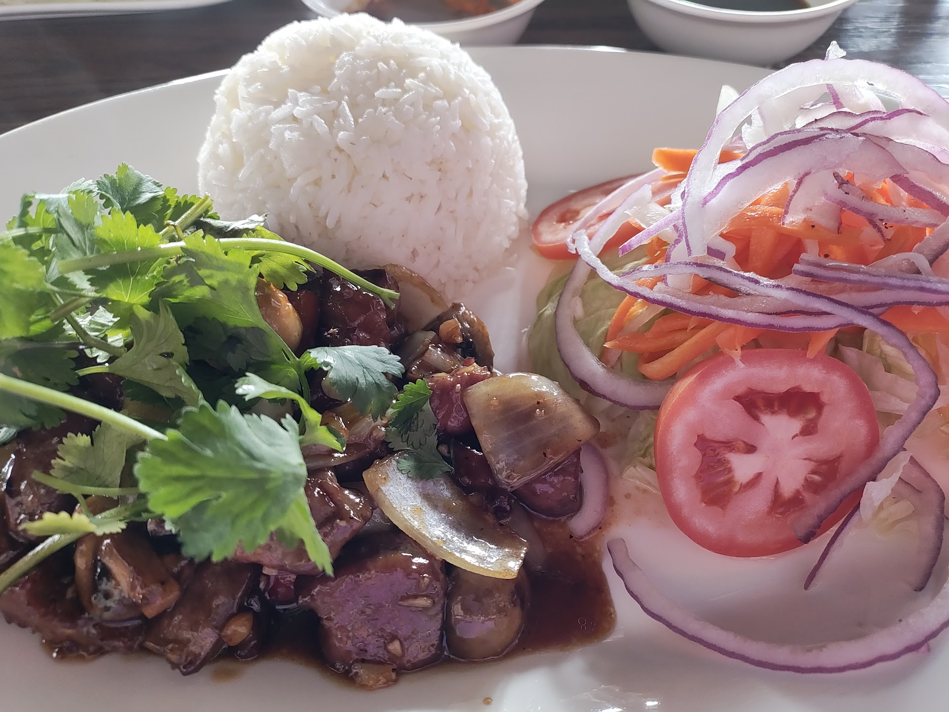 The food is delicious! We started with the Fried Chicken Dumplings and the Grilled Meat Spring Rolls - chose pork for the meat. Mom ordered the Grilled Chicken Vermicelli, and I ordered the Shaken Beef Tenderloin with Rice. With the appetizers we received 3 dipping sauces. They brought each of us our dipping bowls which doesn't seem like a big deal, but is in fact a great detail. No double-dipping issues, nobody hogging one type of sauce from the other(s). Actually there WAS a forth sauce in a single bowl to share. But I was with MOM, so no big deal. The dumplings were just delicious, and fried on all sides, not just one, so they had a real nice crisp to them. The spring rolls were really good. Real interesting. Hot on the one side with the meat, and cold on the other with the veggies. Loved them. The bowl with Mom's Vermicelli was huge. She said it was delicious and it LOOKED fabulous. So much food she had two additional meals leftover. I have never had the shaken reparation of beef and I was NOT disappointed. The presentation is just beautiful and the flavor is outstanding. It comes with a simple salad of lettuce, tomatoes, and red onion that is dressed with a vinegar and sugar blend. I have the leftovers at home for dinner tonight. I did also take a slice of chocolate cake home. It was quite cold and hard to cut through, but when I let it come up to room temperature, the icing was fluffy and creamy, and the cake was soft and moist.