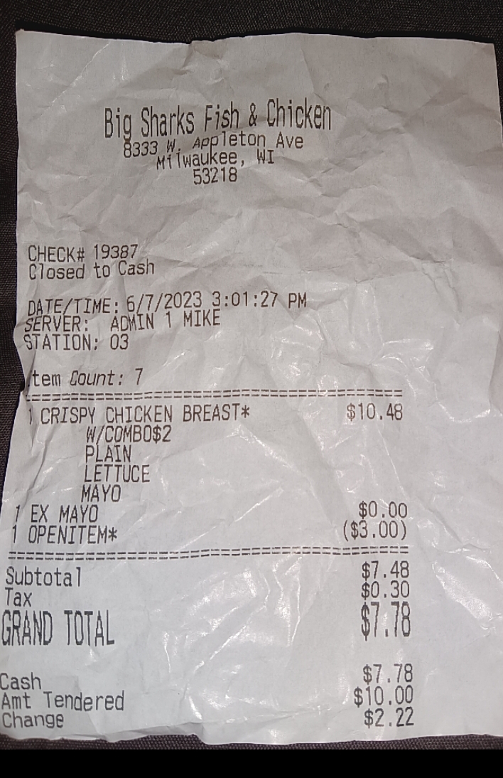 I ordered a chicken sandwich special which came to $7.78 my bread wasn't fresh and the chicken patty was rib meat chicken and not 100% white meat chicken breast. I like the Big sharks on North Ave. The atmosphere isn't the best but at least the chicken patty is 100% white meat. Plus bathroom was out of order. Ugh
