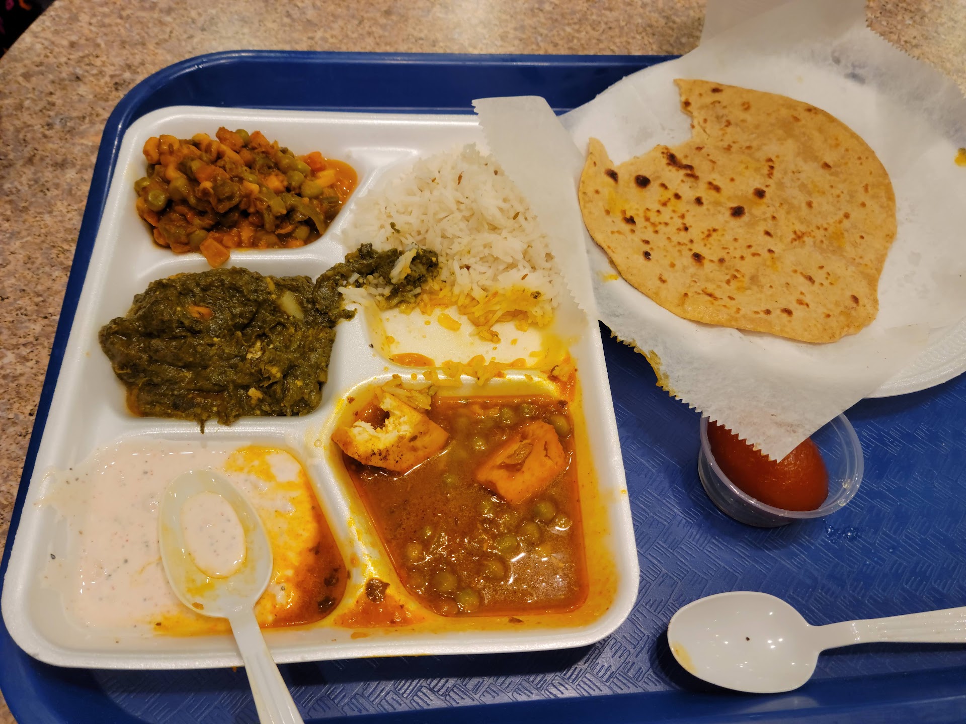 Read moreThe worst Indian food ever! Also mind the fact that it serves food in styrofoam, hot sambar, if it's hot or anything else. Dosa was burnt as well as uncooked in several spots, sounds weird but that's what we got. Almost looked like it came out of a panini grill instead of a flat skillet. Never even tasted it because it did not seem with it with all the uncooked layers. We also ordered a vegetarian Thali. The spinach was as butter and tasting raw coffee powder. My husband spit it out and I ended with an extremely bitter and weird after taste with just 2 bites. The other veggie carried the exact same bitterness. To top it all, everything in Thali was cold cold. Not even warm. I had tried to cancel my order but they left said it's ready and then gave us the cold platter. I refused to pay for more than one dish because the veggie platter was inedible and they should be penalized for serving inedible food to...