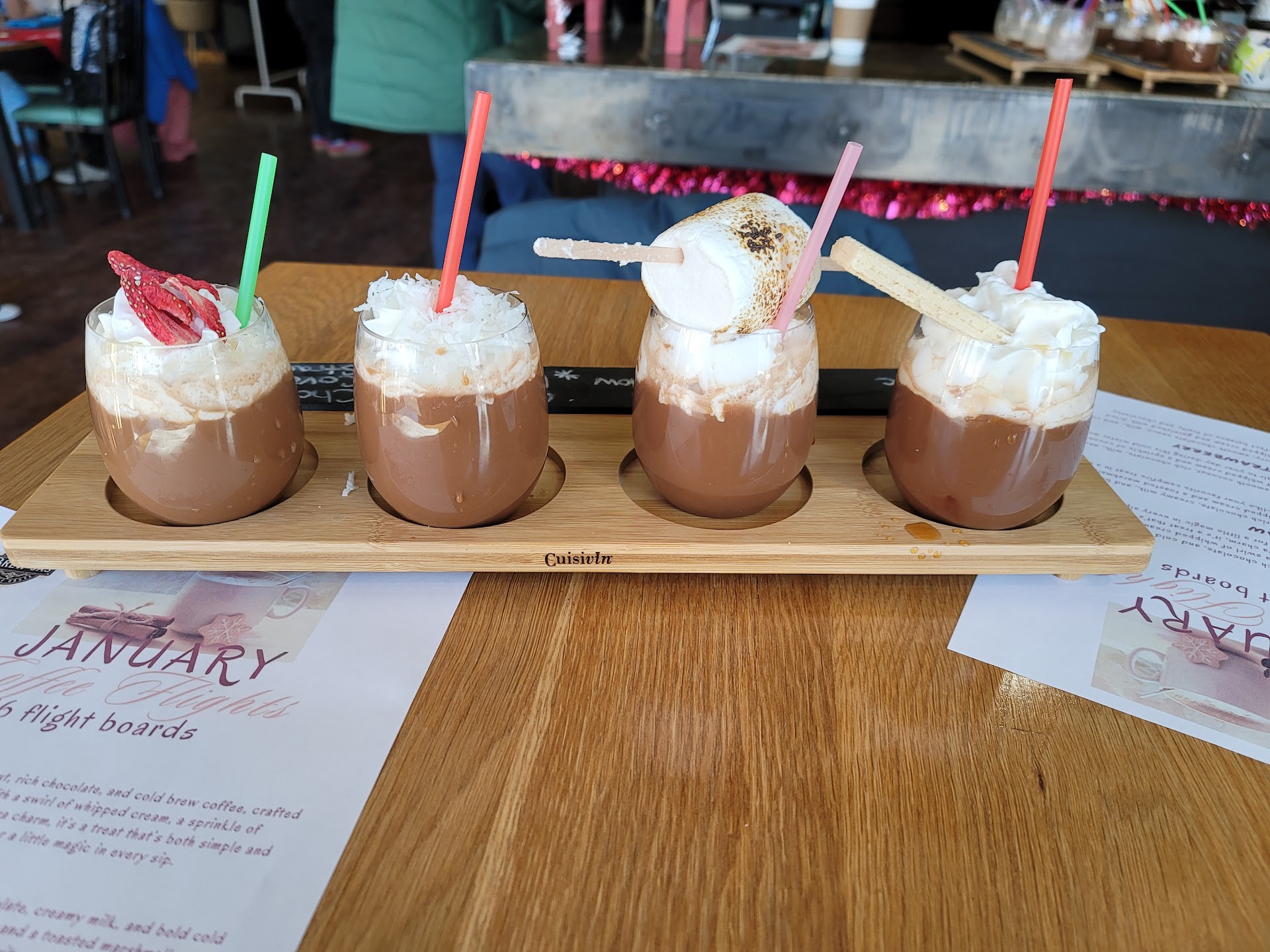 Our flight in particular was made with oatmilk at my girlfriend's request and all the drinks were rich and smooth. Our personal favorite was the coco loco, or something along those lines. It tasted exactly like a mounds or almond joy, second favorite was the chocolate hazelnut one, unfortunately i forget what it's called.