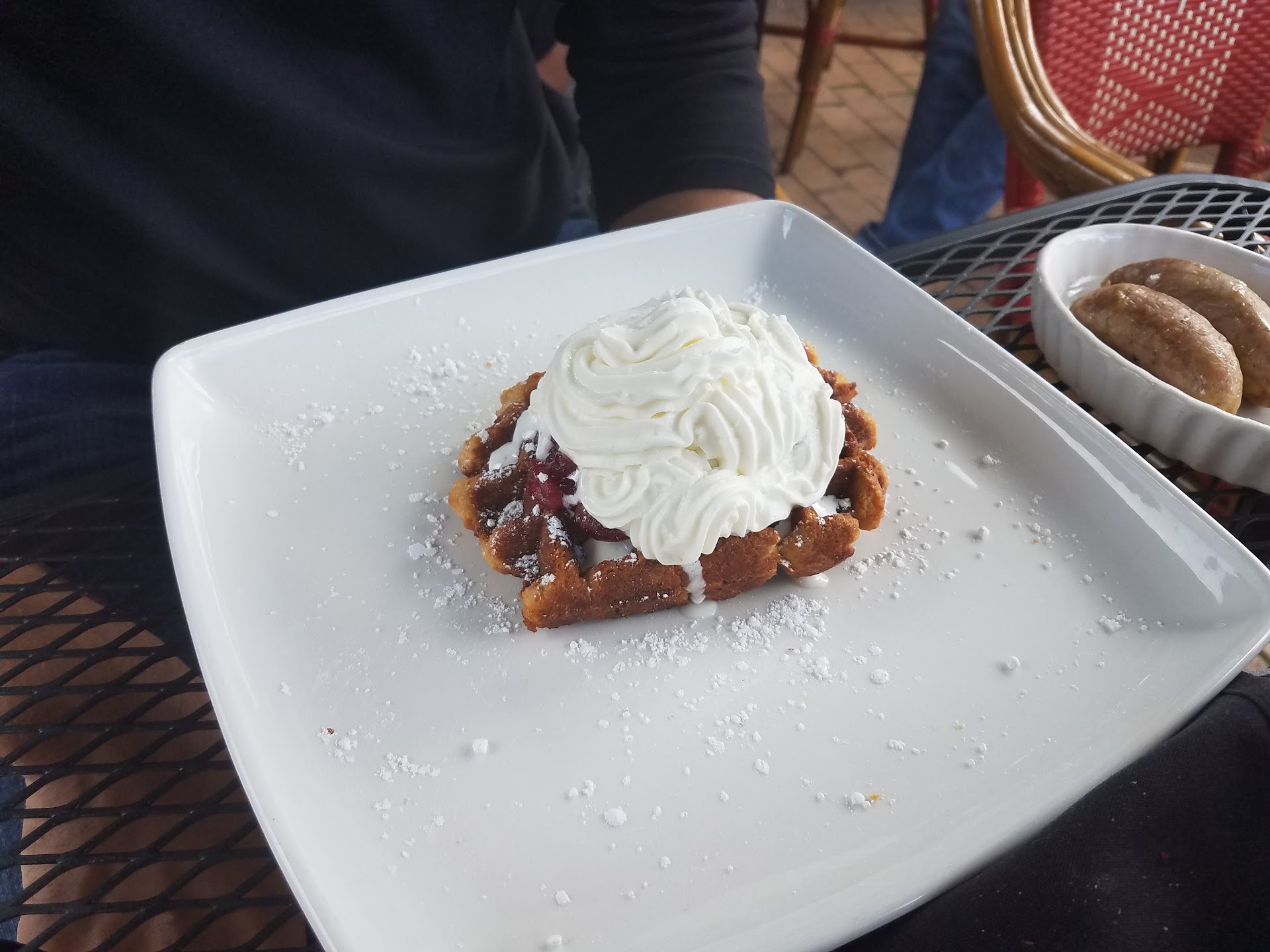 The food was tasty but the portions were small. The atmosphere was lively and the outdoor seating was nice. The bad part about our experience was the time it took for us to get any service. Our waiter was friendly but we didn't get our appetizer for a half hour, when we finally got our food 25 minutes after the appetizer we sat with dirty plates at our table for another 30 minutes before we saw our waiter to ask for the check, and finally 15 minutes for the check. This was a 2 hour experience to get a waffle and a wrap. I would say this is a good place to go if you are not in a rush and have quite a bit of time to spare. Food is good but wait time is long.