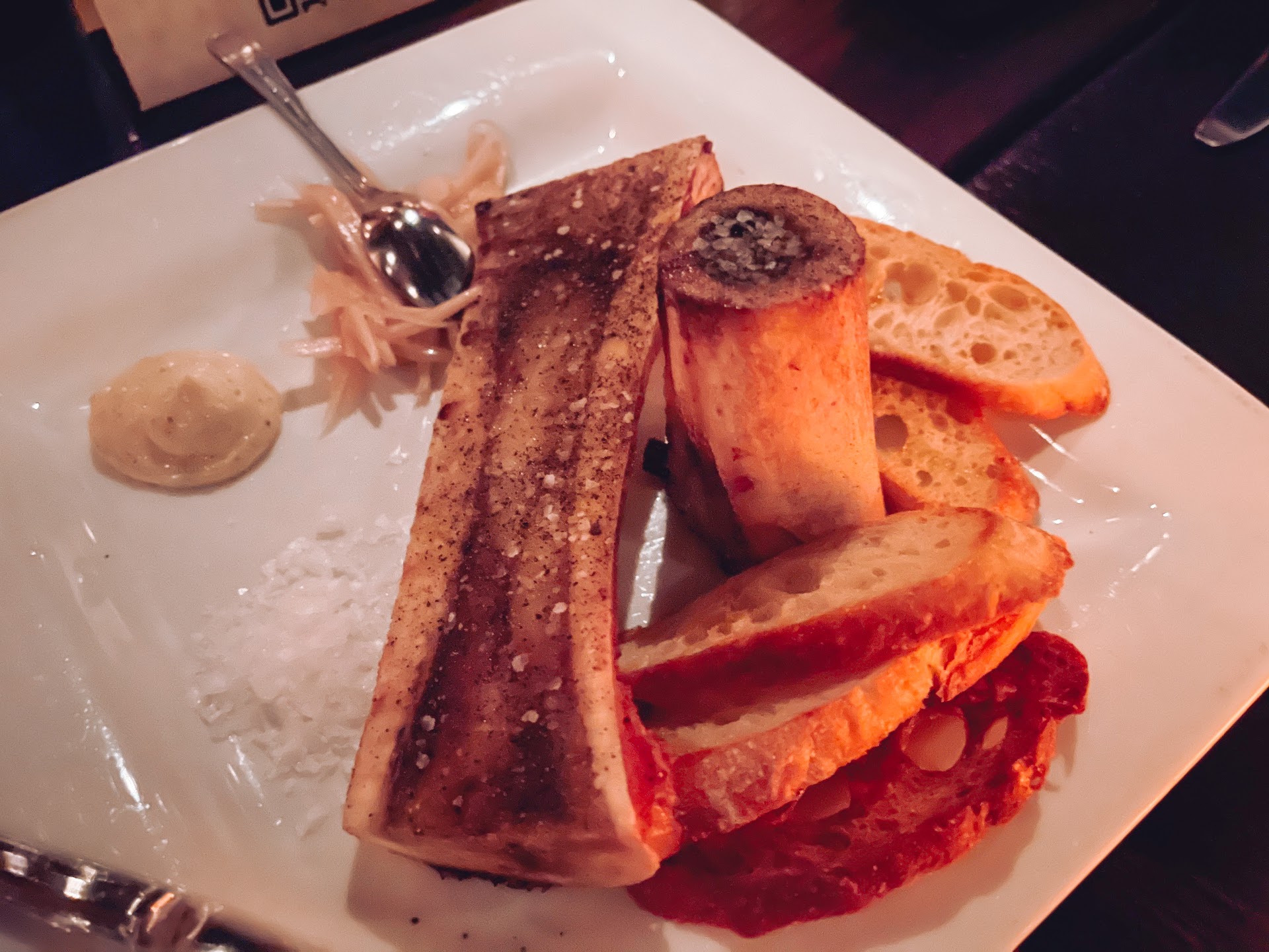 🥩: Food is good. We ordered a domestic wagyu filet and it was perfect. Very tender and in my own opinion absolutely worth the expensive price. We also got shrimp and it was good. The seared fish was good as well but it wasn't cooked to our satisfaction and we were never asked how we wanted it unlike the wagyu filet. We assumed it'll be cooked all the way or close but it wasn't. The seared fish was on the special items of the day. Lobster bisque was amazing. Must try. Roasted Bone Marrow was also good but unfortunately it is not serve with onion jam. It came with not enough slices of crunchy bread and sea salt and some kind of pickled slices of onions maybe? Not sure if it was pickled or what was that exactly. We've had better bone Marrow before. Truffle frities are very very thin and crispy. Don't expect normal French fries. Maybe try steak fries instead?