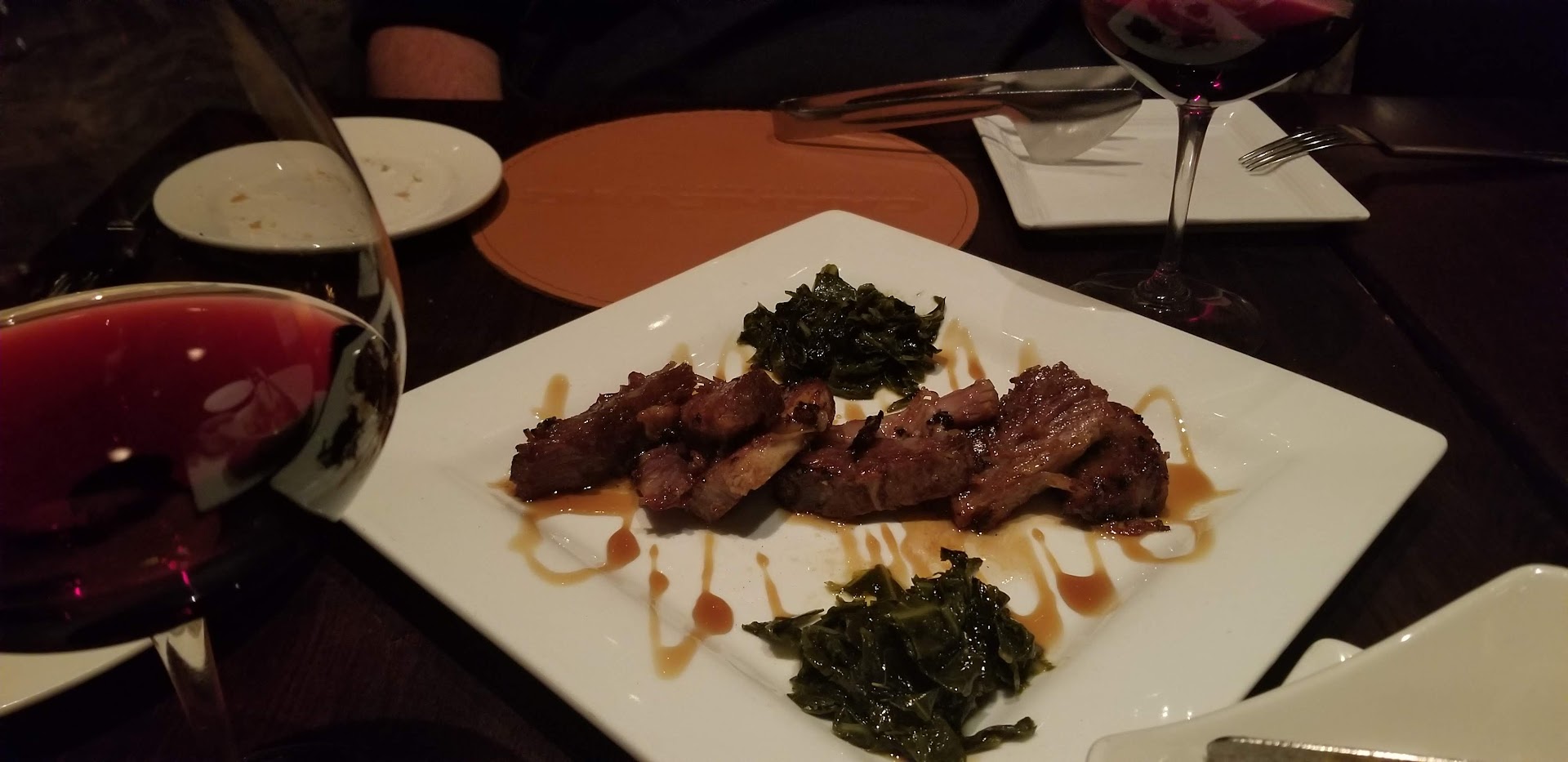 Read moreThis is the first time I've been to the new location. I do prefer this spot to the original. It pains me to write this review because for a long time I felt this was the best not only steak joint but best restraunts period in the city. However that was not the case on this night and there were more misses than hits for our dinner. It was a slow Tuesday the 1st of September. We started with the rock shrimp app and the pork ravioli. The shrimp had a nice light breading and the sauce was average. It honestly could have been poured out a bottle with the label, Kraft on it. A few simple lemon wedges would of really helped it out. New was the ravioli which I've had previously and was fantastic. This time it was barely warm, and the pasta itself was thick, under cooked and gluey tasting, not good. Next we decided to try for another app and went for the maple bourbon glazed thick cut bacon. Why did nobody suggest we try this? This is a must order for every table on every night. It was the best thing we ate this night and I would never come here and not order it. In fact we debated ordering a second one, it was THAT good! The contrast between the greens, and the gastric and the bacon was pure heaven. Next was on to the lobster bisque which we often try everywhere we go. This had a strange off putting taste and was very gritty. The lobster was sweet and tasty but it was not enough to save the dish. It was time for the main course. We were going to split the 60 day dry aged ribeye cooked to medium rare. Combine that with butternut squash risotto and truffle mash. We also decided to add on some scallops for good measure. Since we were splitting the steak we said they could cut it and put it on 2 plates for us. To our complete shock, this $95 reserve cut came out blue. I mean completely raw in the middle. With just a glance I could tell, I mean they did cut it, could they not have seen this? When touched it was cold, like under room temperature cold. I normally send nothing back and don't feel like I'm to critical but for this place and this price, I had to. The staff was excellent as always and whisked it away and in a few short minutes it came back out and it was pretty good. Not great, like I've had steaks here in the past, but ok. I felt it was much smaller than the size listed and probably should of went with something else. I would never get this cut again as I've had much better around town, or Vegas. The scallop add on was just pathetic. First $16 for 2 that were not much bigger than a quarter. Ouch. Second, they were rubbery with no color and just plain terrible. Avoid ordering those at all cost. The risotto was very nice and the mash were very good. In fact the second best thing we ate all night. We followed that up with a chocolate cake dessert which was the third best thing we ate. No coffee was offered and that would of been fantastic with it. We did also have a bottle of wine with dinner. For a almost $300 dinner for 2 I left feeling very cheated. When I thought about this meal in the following days I actually was mad. Luckily this was not my first time there, if it was I for sure would never go back. There are just to many other places with superior food. I cannot justify the price to dine here anymore after this meal. The staff overall were very nice and did a great job. I did find it odd that nobody said anything about the steak being...