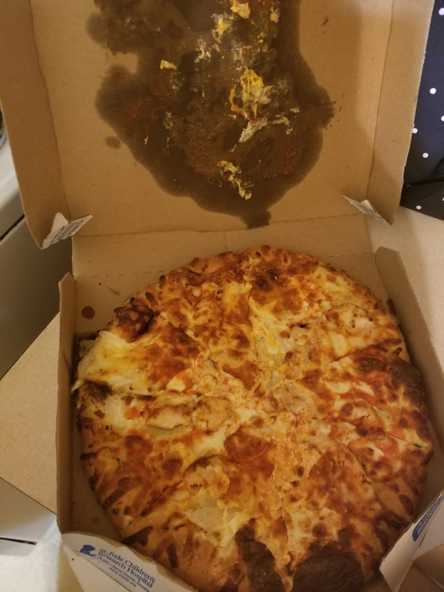 If you see the pictures this was clearly baked well done on the outer part of the pizza but the center was soagy and not fully baked. Most of the pizza was unedible and I would've called to replace it but they would've told me it's because of the toppings, .. but it's my opinion that..basically if a pizza turns out like this they shouldn't sell it, ... when they do the quality check and it looks like this they should call and say "hey your pizza didn't turn out, would you like to try a different combination?" ...