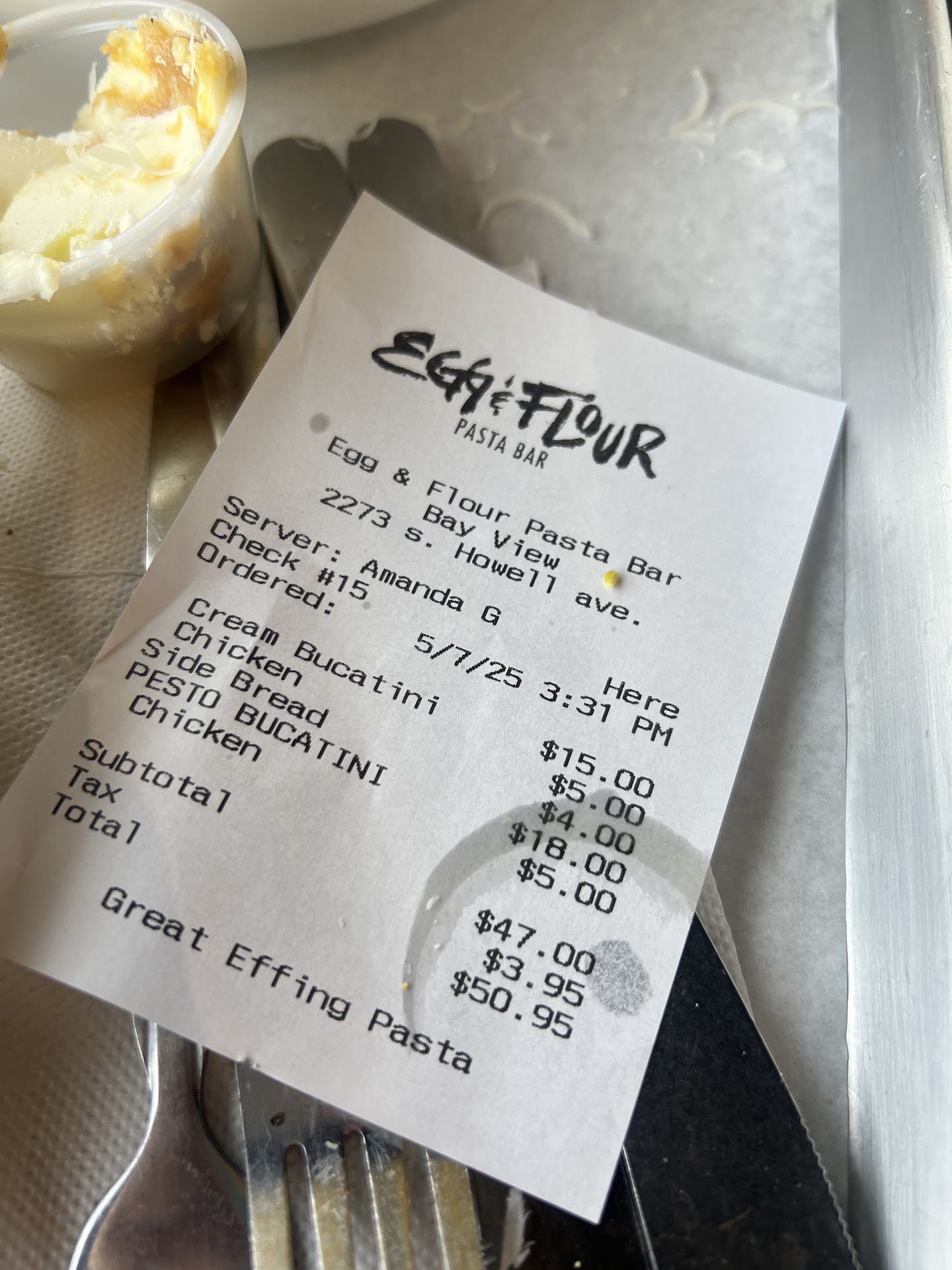 2 pasta dishes with protein and 1 side of bread, no drinks totaled to $50 with taxes. I can say with certainty that the quality of the food is there and that’s where all your money is going. You can taste the freshness in the sauce and the thickness of the pasta! The bread was fresh and perfectly baked.