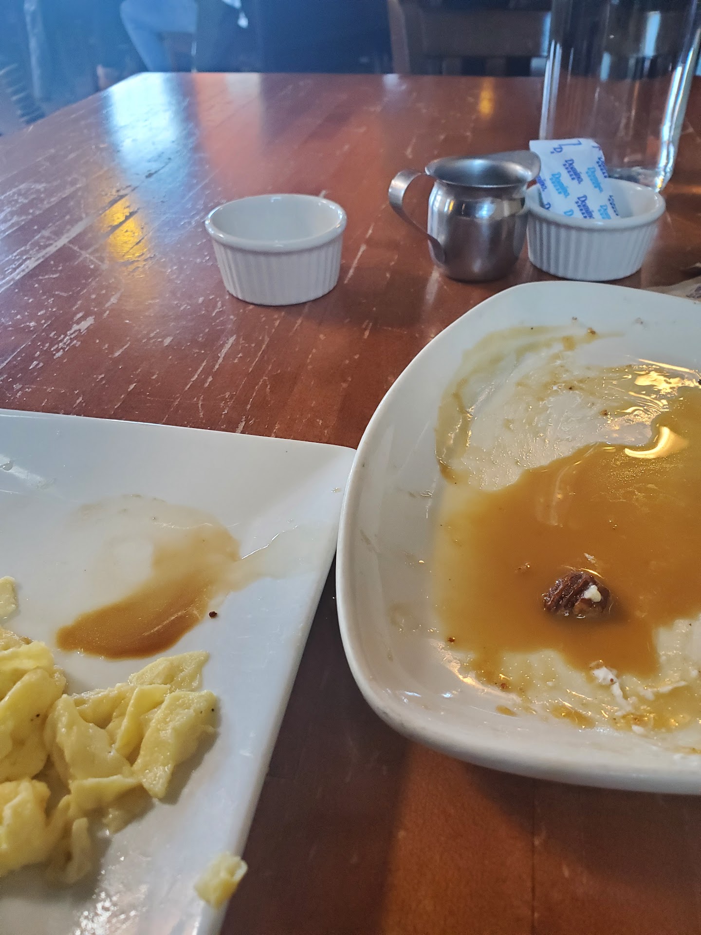 It is very rare that I don't leave a tip but the service was terrible and no matter how hard I tried to talk myself into leaving a tip, I just couldn't. This was my first (and last) time at this establishment and usually when I tell a waitress this they go out of their way to give suggestions on the menu. Not Barbara. She was walking away as I was telling her I was a newbie and wanted to look over the menu. She took so long to come back to the table that the young lady that was delivering other diners food noticed that I was out of water and stopped to ask if I wanted more and if I wanted anything else to drink. I asked if they had decaf coffee and she said yes and brought it right away after she was kind enough to tell me about the items on the menu that I had questions about. After she left the waitress finally returned and asked if I was ready to order. She took my order in a not so friendly manner and left. I took a sip of coffee only to find that it was cold. The waitress never came back to the table so I couldn't tell her, but when the young guy brought me my food I asked for salt and pepper and more decaf because mine was cold. The young lady who had brought the coffee stop back by to apologize for the coffee being cold and to inform me that she had just warmed it up before she brought it to me and asked if I would like for her to warm it up some more 😳. I then asked her if they could brew a fresh pot and she said she would have to check and see. Needless to say, they didn't. She brought me a cup of coffee so hot that even after adding cold cream it was still super hot. I had to let it sit and after it still hadn't cooled down, I poured half of the hot coffee into the cold coffee to see if I could drink the first one but it was too cold from sitting so long so I then poured the cold coffee into the too hot coffee. Only then was I able to drink it. I ordered the sticky bun pancakes (they were good but dry), chicken sausage (really good and the reason I'm giving 2 🌟) and 2 scrambled eggs which were SOOOO salty. I don't think I've ever been to a restaurant that salt and peppered their eggs and I'm glad I didn't salt them myself which btw, the only reason I didn't salt them is because they brought me salt and pepper poured side by side in a little bowl with no means of getting it put of the bowl unless I resorted to using my fingers like I was a chef. The waitress did perk up once she brought me the check and actually came right back to the table as soon as placed my card on the check. Told me how pretty my name was and everything when she brought my card back. Too little too late. Very disappointing breakfast to say the least. The picture I posted is of the mess I made on my plate trying to make myself...