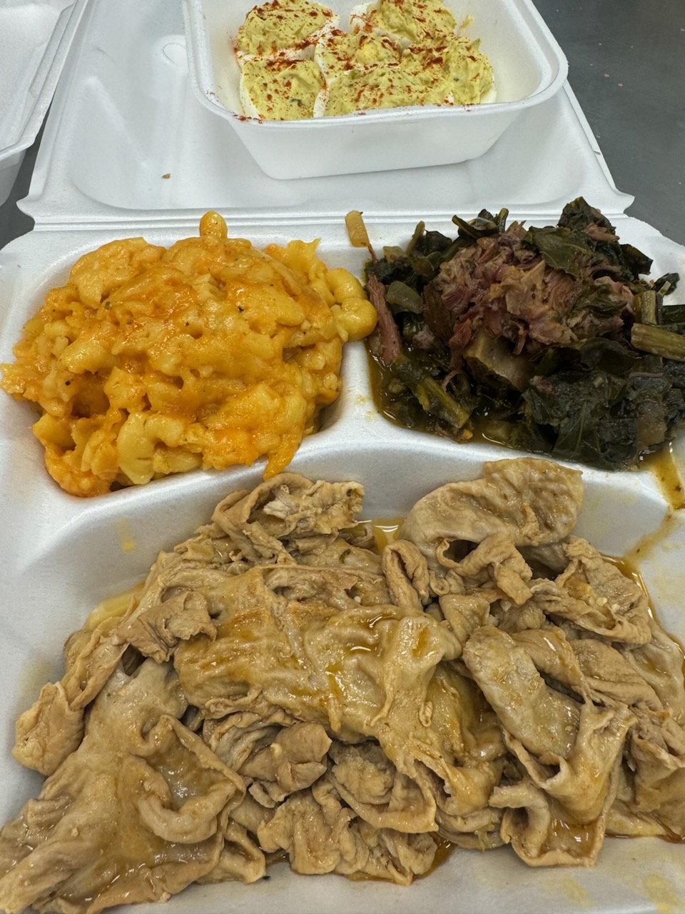 I ordered smothered pork chops, dressing and mashed potatoes. Pork chops were fried too hard (barely could taste meat, just crust) not smothered and I didn't get any gravy. Dressing tastes like stove top but it was ok. Seemed like mashed potatoes though. These ratings tricked me real good. 7 mos pregnant and I'm upset now! All I really wanted some mashed potatoes with gravy.