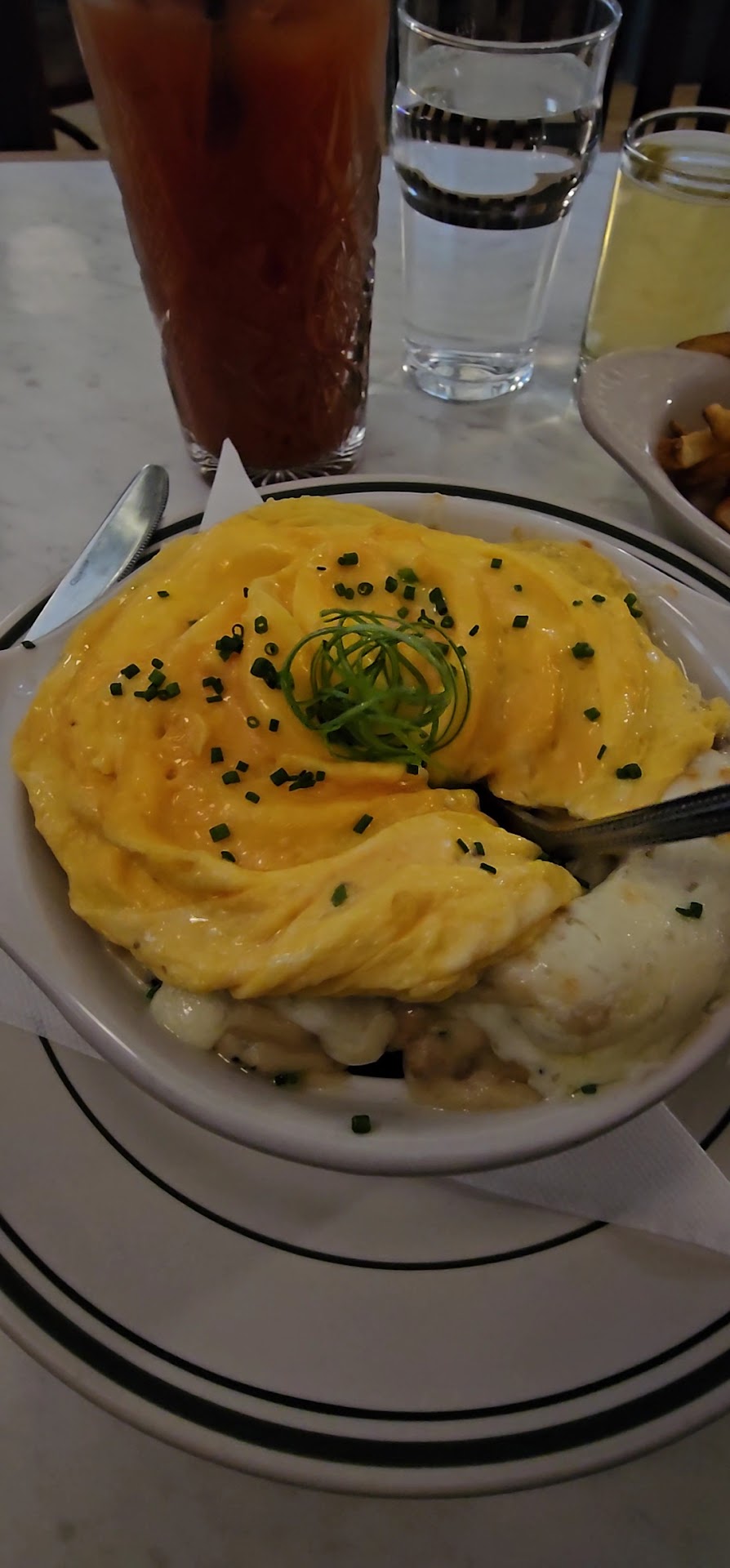 After sitting down and looking through the menu, I decided to order the Breakfast Casserole with a side of their House Fries with Aioli and, always, a bloody mary (opt for their Honey Pie's Classic Bloody). The food came out quickly. Let me tell you, the casserole was as cheesy as can be and given in a very generous amount. It comes sunny, but I prefer and ordered my eggs scrambled. It wasn't what I expected in a casserole, but once I dove my fork in, all the cheesy goodness, sausage, and gravy came out. Underneath it all were the potatoes and biscuit/pie crust. It appeared that it was made like a pie, which I thought was different and unique for this casserole. The flavor and taste were a bit on the sweet side for my liking. The fries were seasoned very nicely with seasoned herbs. However, I didn't care for the aioli too much. Even with the flavor, it tasted too much like mayonnaise. Their Honey Pie Classic Bloody Mary was a bit disappointing as I've heard great things about it. Didn't particularly like the taste - I can't pinpoint it, but just wasn't the right flavor for me. The mimosa, which I made the decision to have later and wanted to try (because it brunch so it's a must!), came out in a tall glass cup and was too sweet for my taste, as well. However, I'd have to say it tasted like freshly sweet squeezed oranges, which is always appreciated. Once I was done with the meal and before asking for the check and boxes to go, I was asked if I wanted a pie for dessert and was shown a menu. Unfortunately, I kindly declined - my taste buds aren't too fond of sweets (as you can tell), and I didn't get a pie. Now that I think about it, I wish I wouldve gotten a pie "to go" because I've heard they're extremely good. Hence, their name 😉
