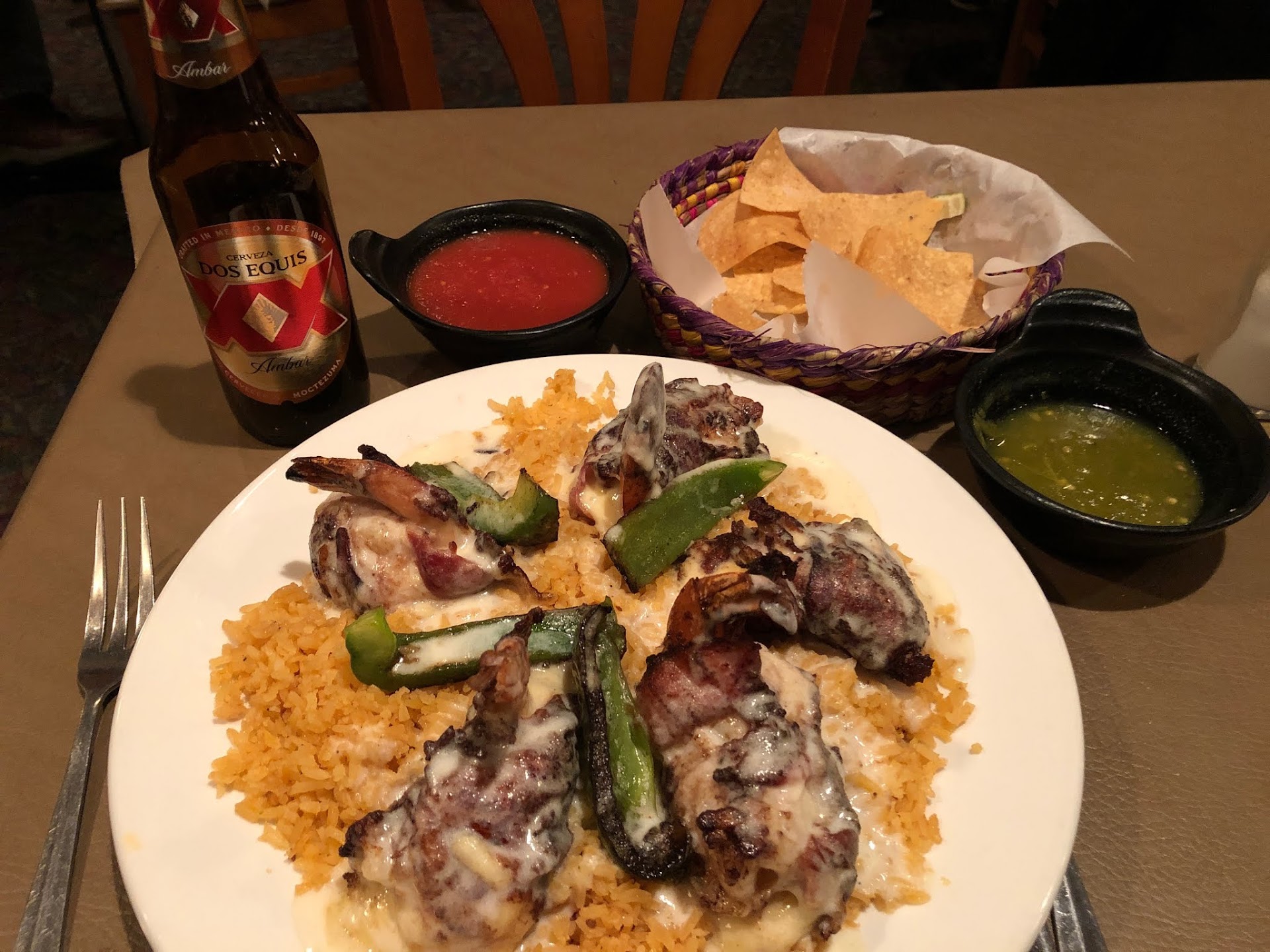 I found Jalapeno Loco only because I overnighted down the street at the Four Points. What a fortuitous hotel stay that was. Who knew that one of the best Mexican restaurants in Milwaukee would be this somewhat unremarkable appearing restaurant next to Milwaukee Airport? So I saw the Shrimp Gabardina on the menu, and then asked my waiter what was popular, and he said... the Shrimp Garbardina (meaning coated, I believe). So I ordered that and was served five large shrimp stuffed with Chihuahua cheese, wrapped in bacon, sauteed in a tequila sauce, served with bell peppers and rice, all topped with a white sauce. The best way I can describe the taste is to say, sometimes I wonder what food in Heaven will taste like, and this answered that question. Sometimes you imagine there could be a food out there that will define a whole new flavor experience, and this plate at Jalapeno Loco confirmed it's possible. They should rename the restaurant to Sabor Loco!