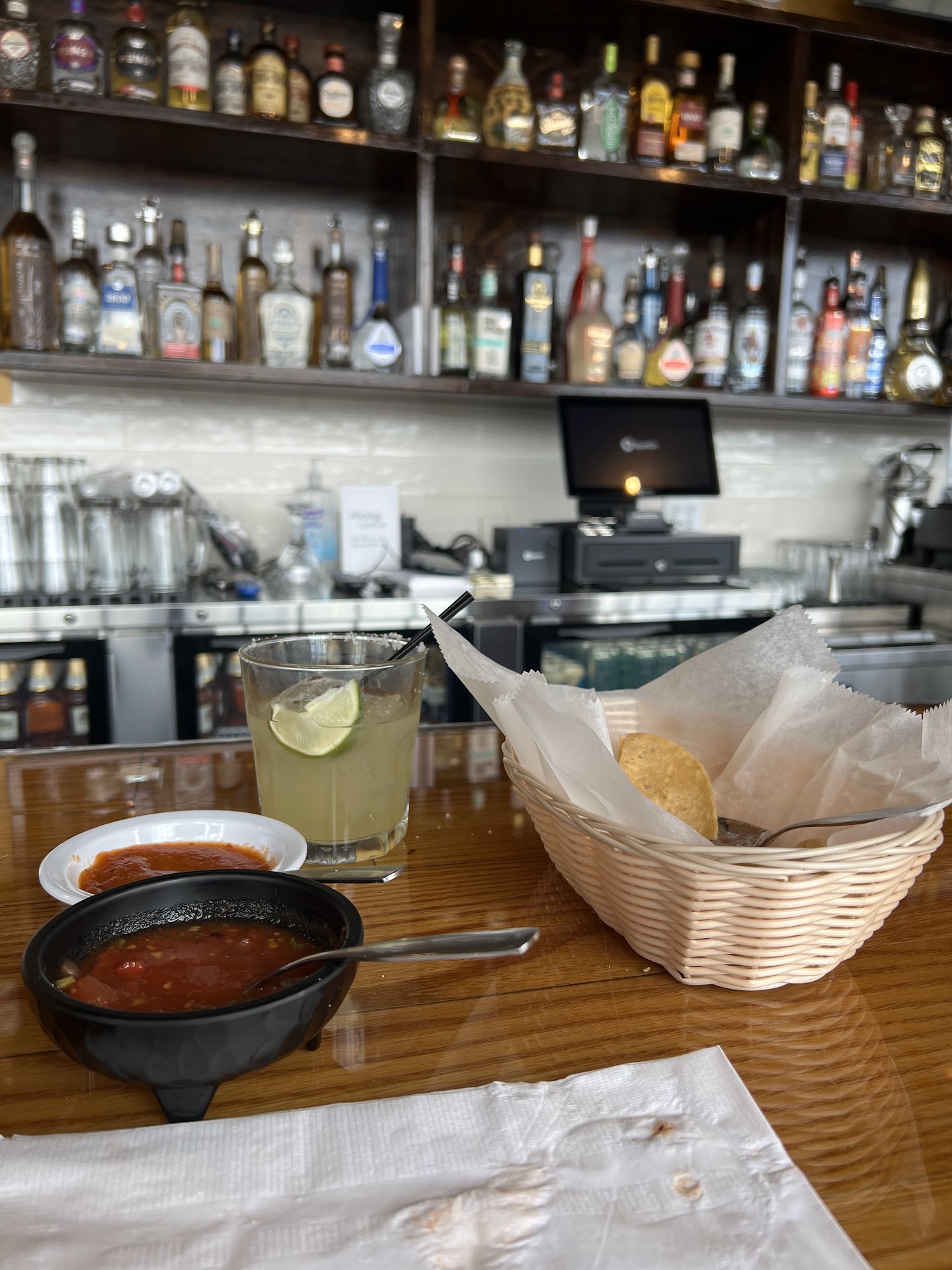 Read moreBrand new restaurant, only open about a week or so! A lot of good things going for it like beautiful interior space, outdoor seating area to come, great margaritas, fantastic salsa and chips, and a parking lot so they can have lots of customers and I hope they do very well in this location. Being a vegan and a vegetarian, we usually have very good luck finding entrees on Mexican menus, so we popped in without doing our normal research on a new place to see if they had anything on the menu that was vegan/vegetarian. Unfortunately, their menu had no items for us. But we didn't give up - we asked our server if they could possibly make us a burrito, mine without any dairy, and my boyfriend's with cheese and sour cream. They said yes! She said they could use faijta vegetables. So we were off to the races. While we waited we had delicious salsa with chips, and two very, very good margaritas, peach and regular. The peach was slushy and the regular was on the rocks - both done to perfection and tasted fresh, not made from concentrates. And bonus - they came without plastic straws! Instead they had the lovely recyclable straws. Good on them!!! Now for things that need improving: the space was very loud - there is no soundproofing in the ceiling and while there were only 4 other patrons in the restaurant, the sound of their laughter coupled with the TV sports playing made the space hard to converse in. I can only imagine how loud it's going to be when the place is packed. For some reason we had two different servers waiting on us (were we supposed to give double the tip?), and when our burritos came, they came without utensils. They were very large and I was wondering if we were supposed to eat them with our hands, like at Taco Bell. We didn't wait to find out, so we asked for utensils and they came wrapped in paper napkins, a fork and a butter knife. Luckily, the flour tortilla the burrito was wrapped in was thin, so it was easily cut with the butter knife, I didn't have to struggle with it. My burrito was indeed vegan, but my boyfriend's burrito came vegan also, even though he ordered it with cheese and sour cream. There was none to be found inside or outside. The interior contained a lot of green lettuce, onions, peppers, and tomato. No rice or beans. I poured the salsa on top and dug in. That really, really made the burrito tasty - I highly recommend using the salsa as a topping. For dessert, my boyfriend ordered some cheesecake with strawberries on top and he said it was very good, although it came with two plastic forks. $50 for the whole shebang. So for us, this new restaurant was just OK. They'll get better with age, I'm sure, so I'm hoping one day they'll have vegan items on the menu, soundproofing, utensils that come with your entree, and drop...