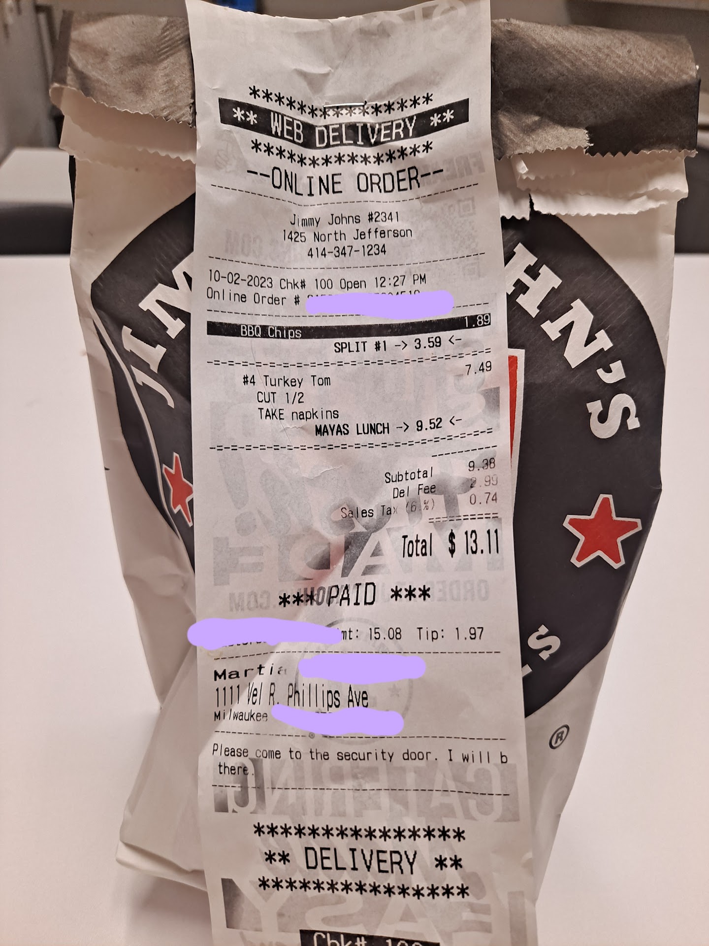 Looking at the receipt I ordered at 12:27pm. I'm just getting my lunch....