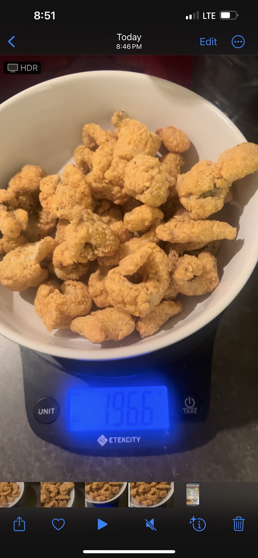 The catfish nuggets are advertised on the menu as 1 pound like most places. One pound = 453 g. Mine came out to 196.6 grams (see photo/video). Oil, flour, cornmeal all have weight and even with that weight included this came out to LESS than half a pound. Thats pretty bad. I noticed it as soon as I grabbed the bag that it felt very light.