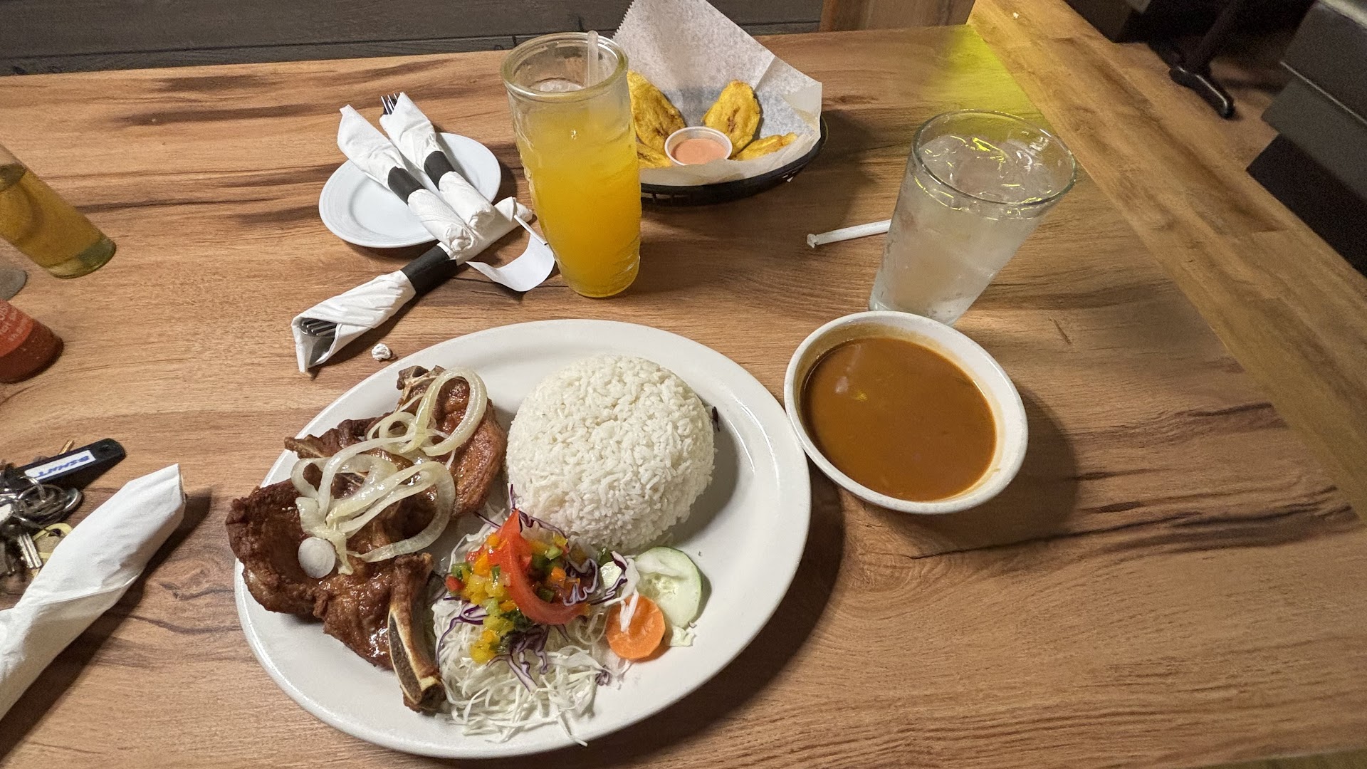 The food is just delicious. I don't know what my friend had because she pointed to the menu and (attempted) sounding it out. It looked really good and she said it tasted wonderful. It was mix of stuff served on planks of plantains that she ate with a knife and fork. I had the Cubano. I have to say I have never had a Cuban that was SO moist before. It was so tasty. And it was HUGE. I could only eat a quarter of it with little bit of fries that came along. I just finished having the rest for lunch. I should have only eaten half of my leftovers, but it was too good to leave for...