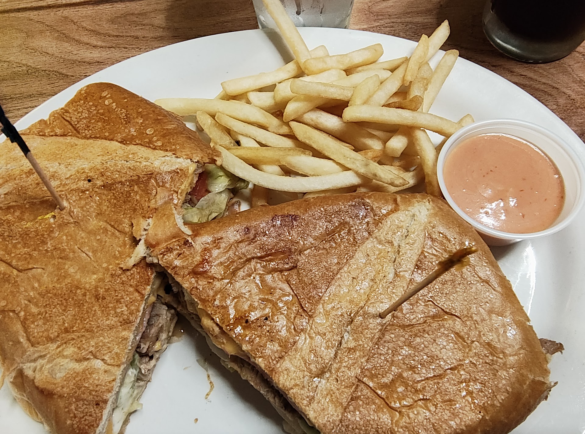 The food is just delicious. I don't know what my friend had because she pointed to the menu and (attempted) sounding it out. It looked really good and she said it tasted wonderful. It was mix of stuff served on planks of plantains that she ate with a knife and fork. I had the Cubano. I have to say I have never had a Cuban that was SO moist before. It was so tasty. And it was HUGE. I could only eat a quarter of it with little bit of fries that came along. I just finished having the rest for lunch. I should have only eaten half of my leftovers, but it was too good to leave for...