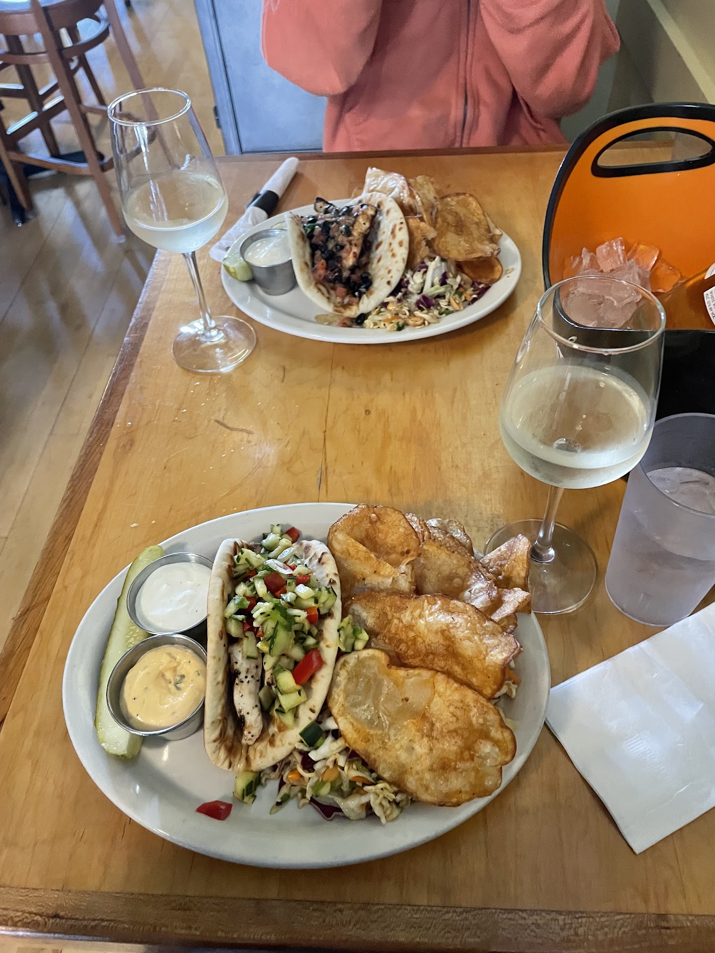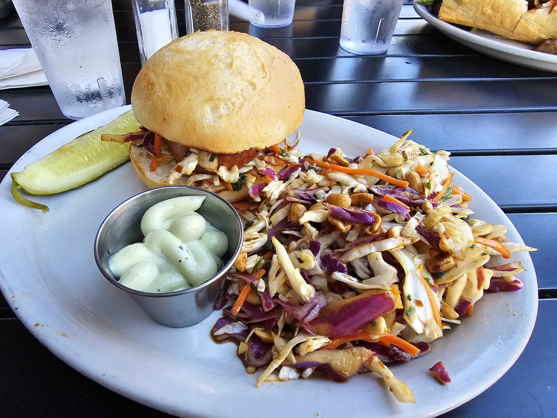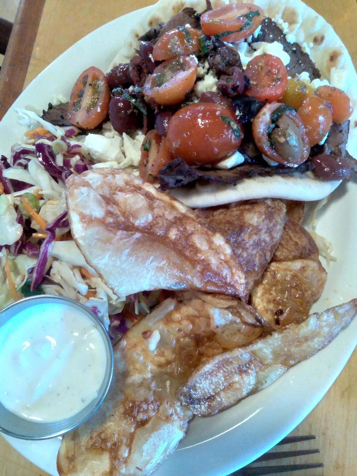 The food is outstanding. I had this week's special - Pepperjack Pub Melt, and Mom had the Mediterranean Steak Pita. We both opted for the little bit of each on the choice of House-made Potato Chips and Asian Slaw. Portions are definitely NOT an issue. There is so much food I was almost full just LOOKING at the plate. And let me say it is ALL super delicious. I wasn't really sure about "just having a burger," but the special was intriguing. Served on toasted bread, with pepperjack cheese, and had slices of fresh avocado, with a side of pepperjack mayo that was just the right amount of kick. Of course you can increase and decrease the kick by how much you put on the sandwich. Perfect. The chips with the bleu cheese dip, and the Asian slaw are equally tasty. Very nice flavor combinations. Could only eat half and have the rest in the fridge at work for lunch today. So excited.