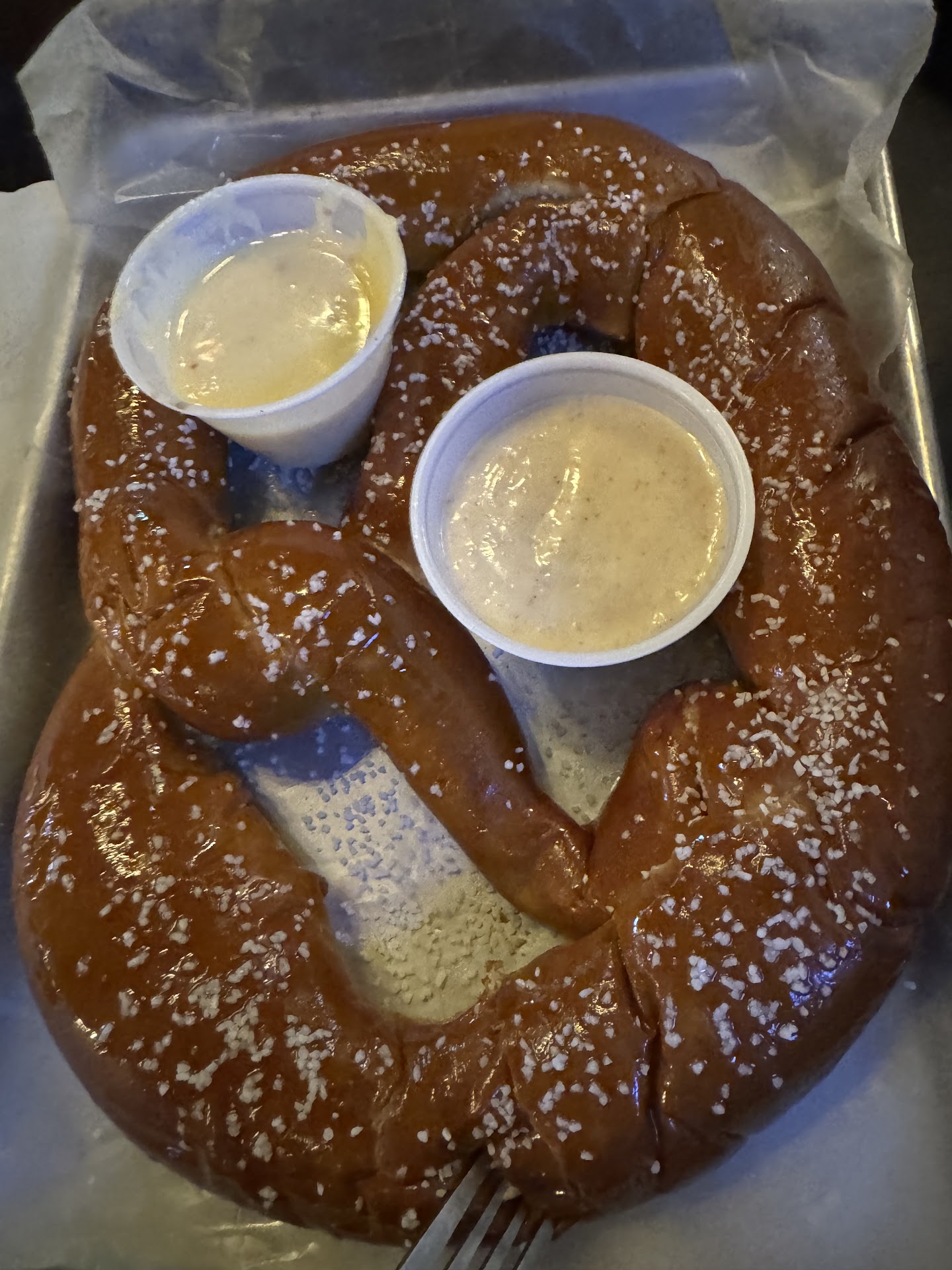 Read moreRead the other reviews which gave one a 50/50 chance at either really good or really bad service. We decided to chance it since we were going to the Riverside Theater afterwards. Got there at a little past 5. Not busy yet. Music was a bit loud making it hard to sometimes hear our server but he was very polite and attentive. Hubby had a beer, I had a lemon drop martini. Definitely more martini than lemon drop martini. The only lemon detected was the wedge on the rim. Definitely more beer bar than martini bar. We opted for the sampler appetizer and that rocked. Spinach artichoke dip with warm tortilla chips, chicken quesadillas and their own cheeseburger shalalees. Everything arrived warm and fresh and oh so good! This plus soup split between two people could be a meal in itself but we ordered entrees. Hubby had the Mac n chicken. He only finished half and he's a big guy. I opted for the Guinness BBQ chicken and shrimp boxty. Not sure what I was expecting when it said chicken shrimp, andouille sausage etc tucked into a potato pancake but it sounded good. And it was. Basically, it's a potato pancake instead of tortilla burrito about 10-12" long and 3+ inches wide STUFFED with goodness and topped with melted cheese and BBQ sauce. After the appetizer, I opted to only eat half to save room for dessert. We opted for the Mo's cookie. Fresh baked chocolate chip cookie toped with some Chocolat syrup and ice cream. YUM. For his first time making one, our server rocked it. Gabriel was polite and attentive without being hovering. Also good about warning that my top plate was very hot. Overall, a very enjoyable meal. Only negatives were the less than spectacular special martini and the music being a bit too loud to easily carry on a conversation. We'll definitely be back and also likely to hit the Tosa location as well when we drive up...