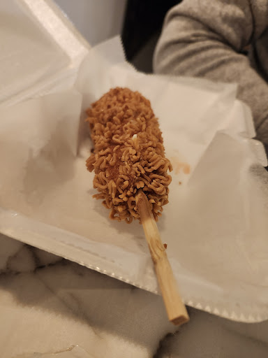 Read moreThe overall experience was pretty great. I would've done 5 stars if it wasn't so pricey and the crowd there was more so for teenagers. For 3 donuts (they're average sized) that didn't have anything particularly special on them, it was 10 bucks. We got 3 hotdogs, 2 drinks, 3 donuts totaling up to nearly 50 bucks. I got the Ube drink, it was pretty good. I recommend getting the regular one without the brown sugar, it's pretty sweet with just the Ube. The Cheeto half and half was really worth it. The spicy mayo goes really well with the 3 combinations of corn dogs we ordered (regular, ramen, hot cheeto). My toddler liked the hot dog part, the corn dogs themselves are pretty big. The garbages were pretty full and overflowing but other than that the kitchen and line looked clean. The decor was beautiful, I really liked that it had a lounging-like area. The service was pretty average, the cashier...