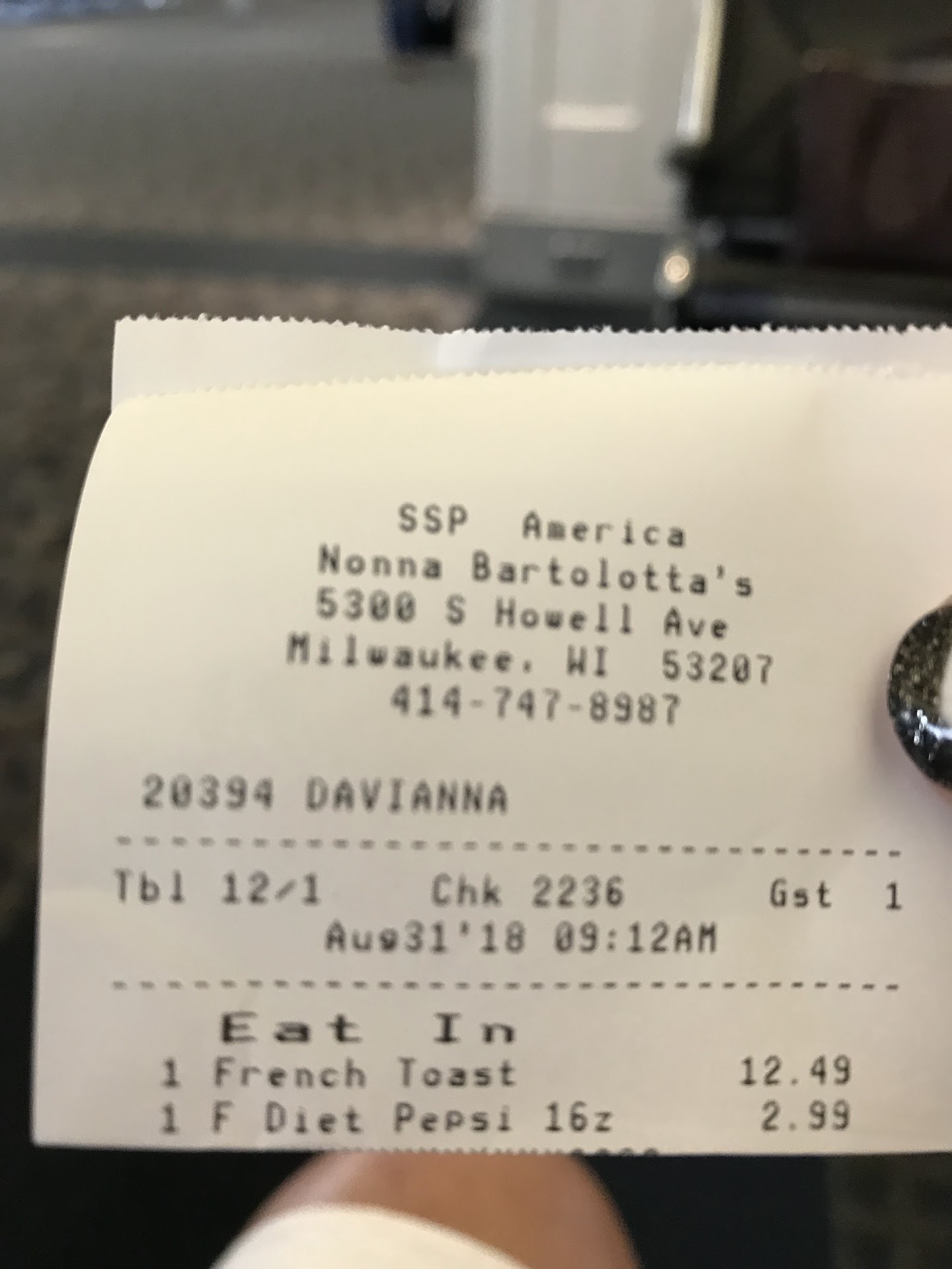 Read moreJust finished a skillet frittata here with plenty of time to catch my delayed flight. Waitress was initially very pleasant but ignored my request for giving me my check. Saw her clear off tables and go into back area behind kitchen. Several minutes later another family approached counter asking to pay their bill. I waited still but stood behind this family so I could be helped next. Waitress did not acknowledge me and walked away toward kitchen again. I decided to leave my money on table and walk away so I could board my plane on time. She then ran after me toward my gate yelling I didn’t pay enough! She brought the credit card slide machine with her telling me she has no help...she’s the only one there. No manager on duty. I found this unbelievable bc I saw 2 other workers serving other customers. She kept repeating she has no mgr on duty...nothing she could do. She wa interrupting me and was very rude. I insisted she stop treating me this way and she kept her poor attitude with me. I said I was so done with this when her credit card machine didn’t work while w we’re standing in the hall near my gate. She then said she was going to report me to the sheriff! I followed her to wait for the sheriff to come and talk to me. No sheriff showed. Someone at Starbucks Indicated I was free to catch my plane without paying for my meal. Thank you! Wow....will be reporting this to Bartolotta Corp office as I am a frequent patron of their other restaurants and this experience was...