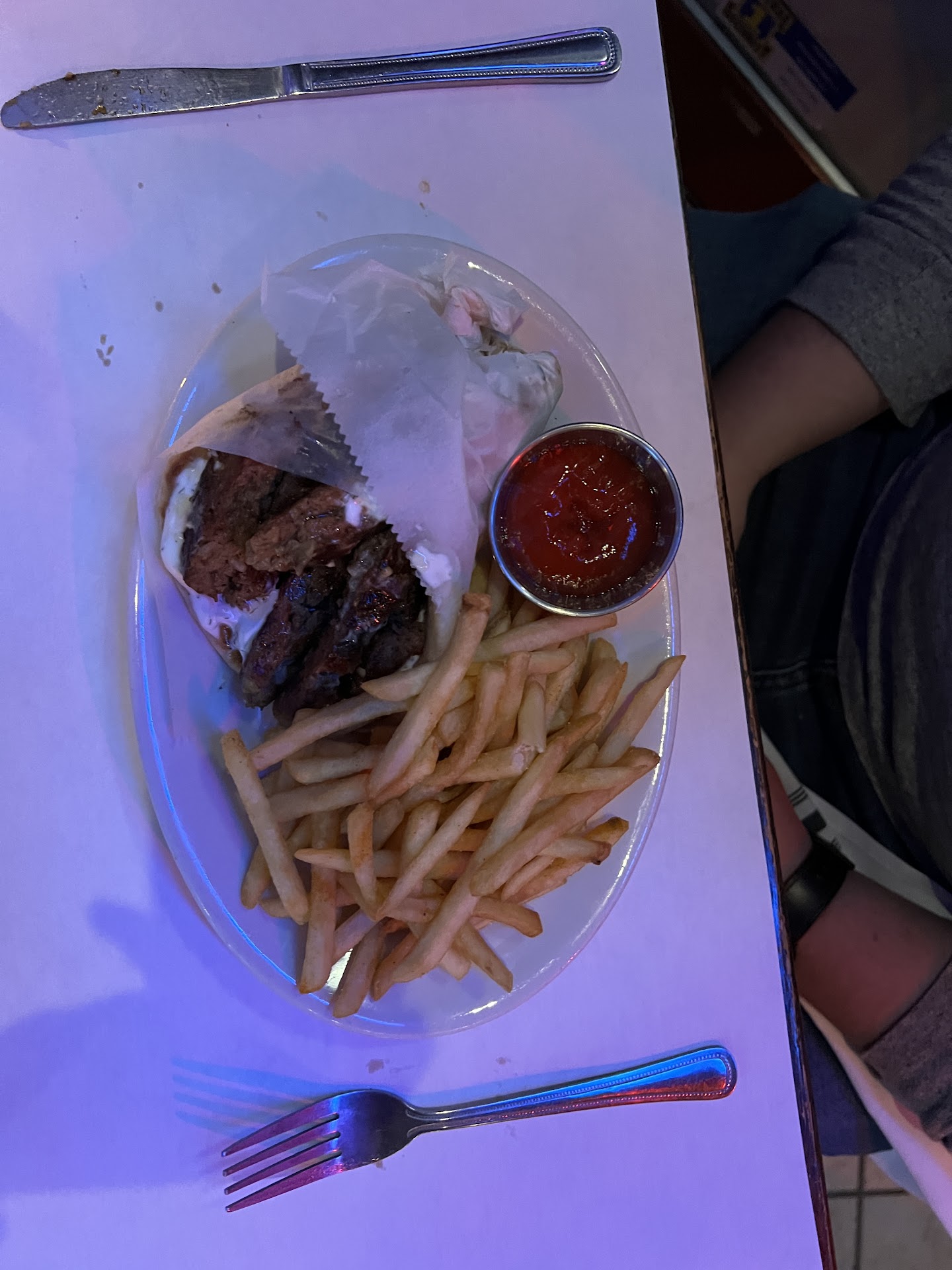 Ordered the Athenian chicken through chow down. Said it would be ready roughly around 11:15. Got to the restaurant at 11:20 and it wasn't even in the process of being made yet. Whatever. I can wait. But that soon became overbearing as the atmosphere was pretty lame, with owner/operators talking about silk shirts and Gucci shoes and getting financial aid for the upcoming semester. 11:30ish rolls around and they hand me a bag of food. When I get home and opened the food boxes I find a burger, a beef tip (?) gyro, and three garlic fries. The amount of food was considerable to what I originally ordered so I wasn't that bummed out. However, the gyro and burger were coated with kraft cheese singles (I'm pretty sure). And both of the meats were fairly sketch. No way could I eat more than a couple of bites out of that burger. The 'beef' was so dry and the bun to meat ratio was too over powering. Not even positive what was in the gyro as far as meat wise, may have been lamb? Don't expect anything fresh at this place. If you want Greek fast food, make your way to gyro...