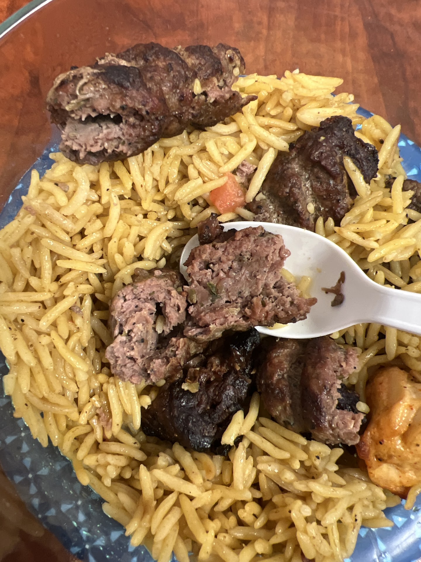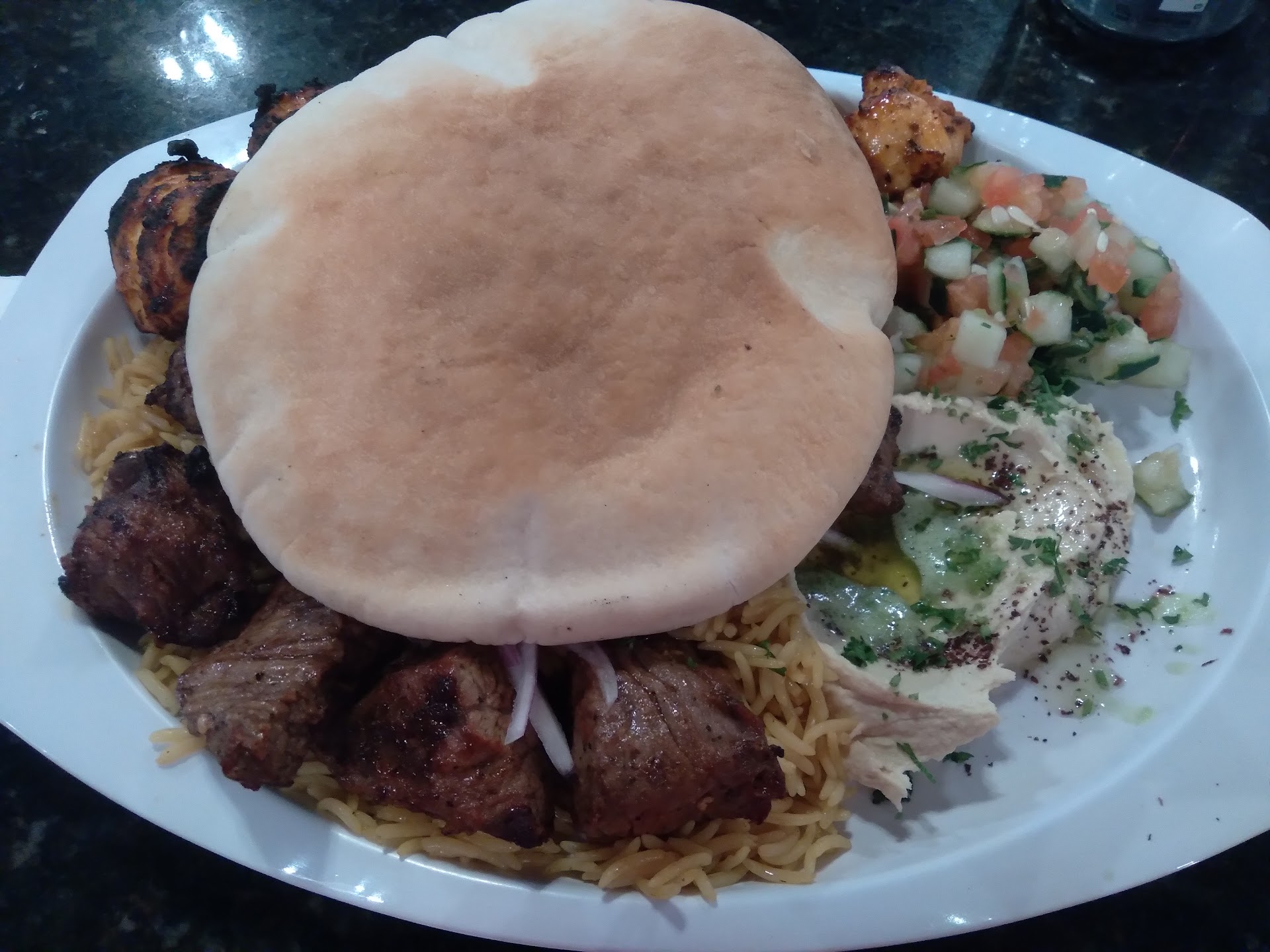 The food. SO good. People in our group ordered the Chicken Shawarma, Chicken Shish Tawook Plate, a couple Beef Kafta Kabob Plates, and I had the Mixed Grill. The chicken was so flavorful and real juicy, the kafta tasted wonderful, and the shish kabob - oh my! The beef was SO tender and had so much flavor. The rice, Arabic salad, and hummus were a great compliment to either eating with a fork or stuffing into the large pita that came with the plate. Enough for multiple meals so I will be enjoying it again this evening. Looking forward to it already. The photo with the pita on top is how it is brought to the table, and I also took a photo of how it looks with the pita removed.
