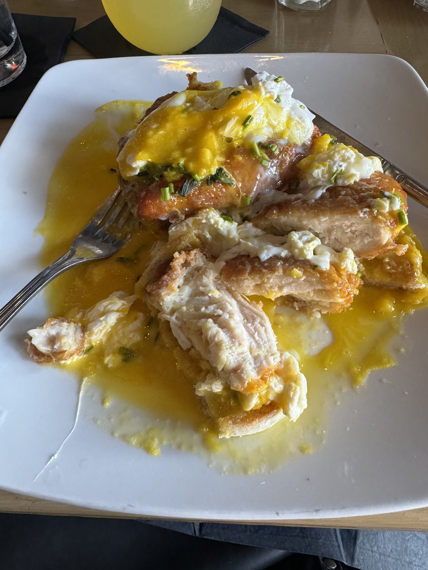 It took around an hour or more for the food to come out after ordering, which was surprising considering things were relatively dead inside. Service was accommodating and understanding of the rare send-back (of the Benedict), and they took it off the bill.