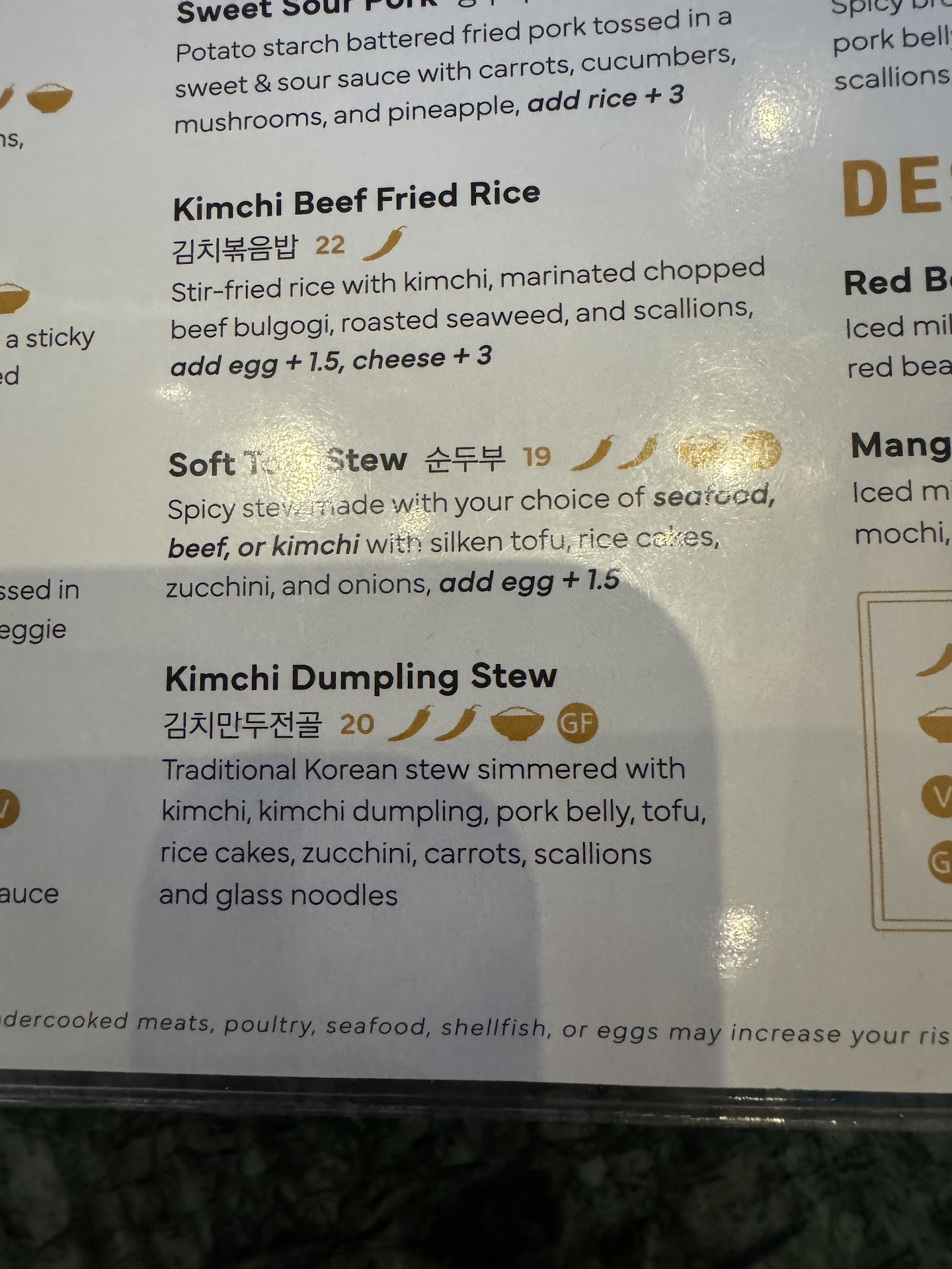 Read moreI ordered the Kimchi Dumpling Stew menu description a âtraditional Korean stew simmered with Kimchi, kimchi dumpling, pork belly, tofu, rice cakes, zucchini, carrots, scallions, and glass noodlesâ. Unearthed one tiny 0.3 oz piece of pork (not pork belly)in the dish. Laughed about it with dining partner, brought it to the attention of the server, and requested more pork. Ten minutes later the unseasoned broth got cold and the server set a small plate in front of me and said âthe chef told me to bring this to youâ. It was another 0.3 piece of pork; that was it. What seemed like a humorous mistake was suddenly a humiliating experience for a reasonable ask based on the menu description. Asked for the check, five minutes later it has not been brought to us so we just went up to the host station to pay. The bartender was up there, explained she was also in charge and apologized. This apology was immediately negated by her trying to reason that they donât actually have pork belly- the menu was wrong and was in the process of being reprinted to remove pork belly from the menu. Incidentally- several other dishes on the menu have pork belly listed. Substituting with an appropriate amount of a different protein or informing me of this ahead of ordering would have been appropriate and reasonable. Things go wrong at restaurants, servers forget things, a dish isnât prepared correctly- no biggie; mistakes happen. Instead the chef chose a deliberate action to humiliate a customer. The person in charge did make the excellent decision to remove the meal from the bill. I appreciated this however I donât go out to dinner to get insulted and a free meal; I wanted a delicious dinner and was happy to pay for it. As someone that has worked kitchens and in server roles I am shocked by the inexcusably terrible treatment I received. Tipped the servers on what would have been the full bill since they clearly felt terrible about what transpired and it certainly was not their fault. I left with my 0.3 oz piece of pork so I could weigh it at home and let you all know about the awful experience waiting for you if you decide...