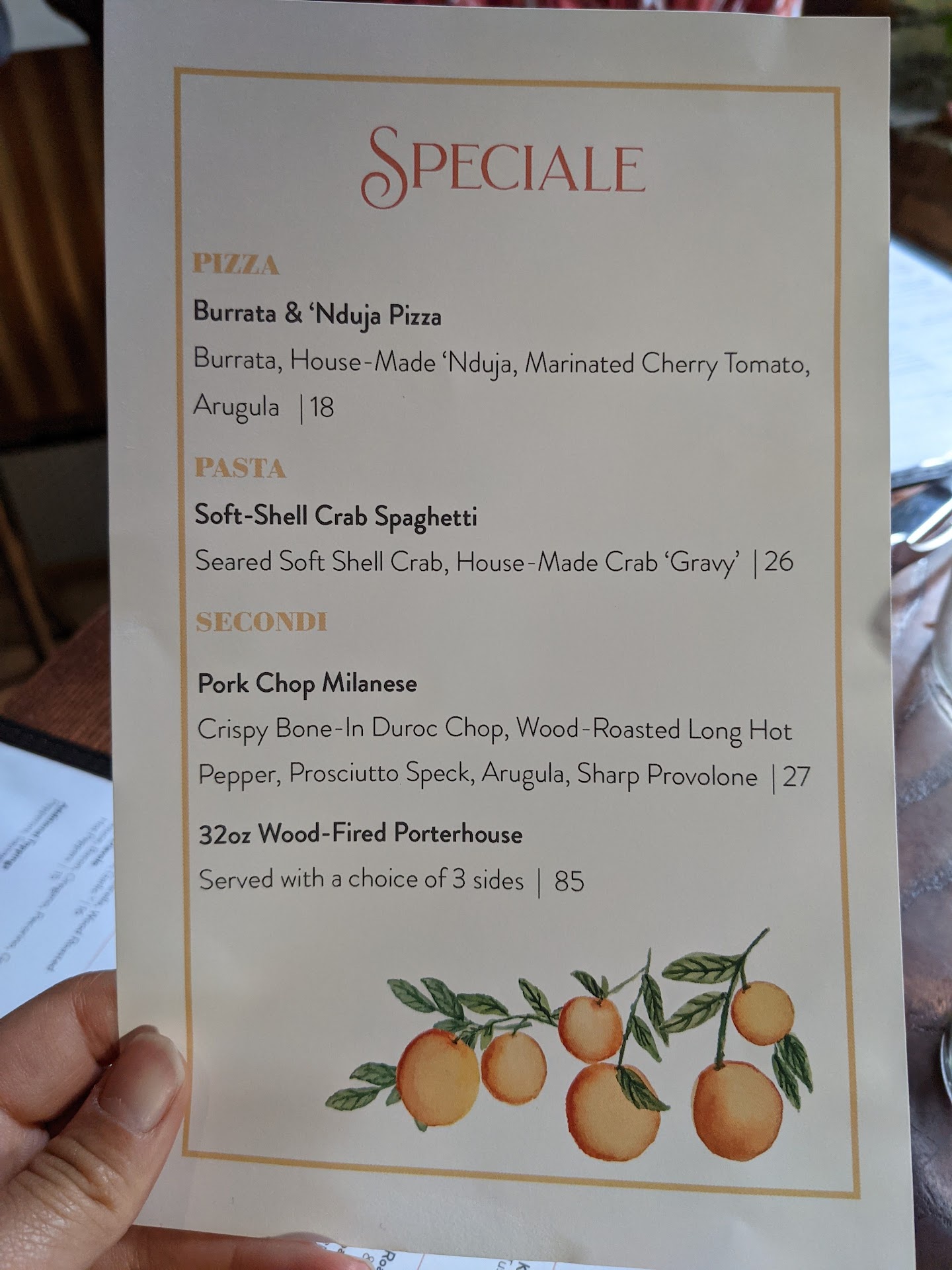 First: atmosphere. We arrived at 8:10pm for an 8:30 reservation. It was the tail end of dinner rush, and we arrived expecting to wait for our table to be ready. We sat at the bar and had a drink while we waited. It was very cozy, hip, inviting. The wine list had lots of Italian options by the glass or bottle. (Sadly, a lot of āItalianā American restaurants do not.) I ordered a Prosecco and my husband ordered a spicy tequila cocktail that was perfectly balanced. Delicious.