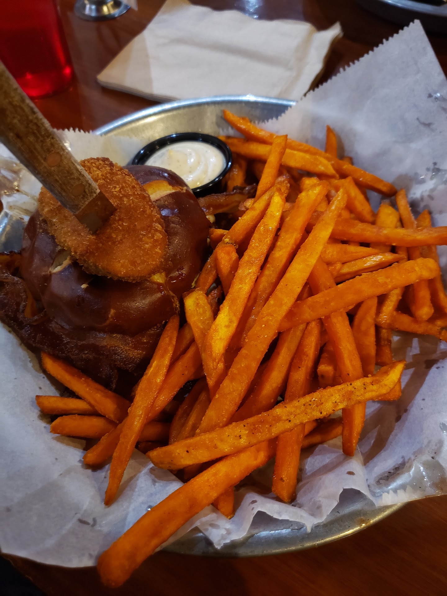 As I was browsing the burger selection, I came across quite a few that I wanted to try. It took me a bit, but I was able to narrow it down and ultimatley chose the Italian Burger. It had maranara, mozzarella cheese, large pepperoni slices, and pesto. Each burger lets you have a bun choice, and I couldn't pass up trying the pretzel bun. That was such a good choice! The burger itself was cooked perfectly to my liking. It was juicy and flavorful. Overall, I was completely satisfied with my burger selection!