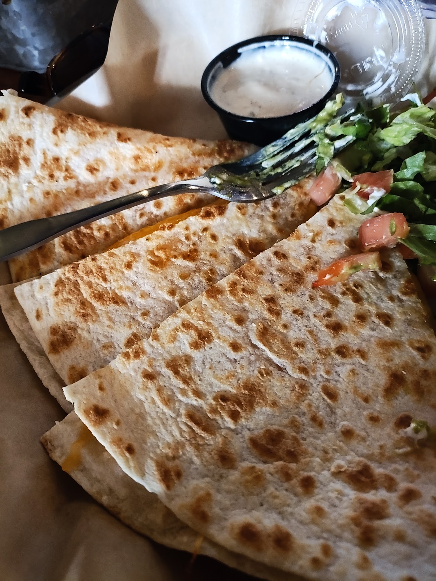 We both had the Honey BBQ Wings with Bleu Cheese. I had the Quesadilla and my friend had the Loaded Tots. Everything was delicious. The wings are not overly sauced so they weren't exceptionally messy. The way they are cooked, they come out more of glazed finished - which is wonderful. The tots were very loaded, and the quesadilla was really cheesy, with lots of fixins. We each could only finish half our dinners - of course. I LOVES me some leftovers.
