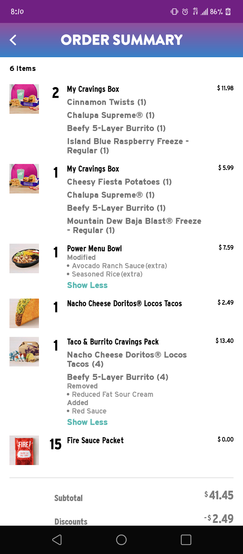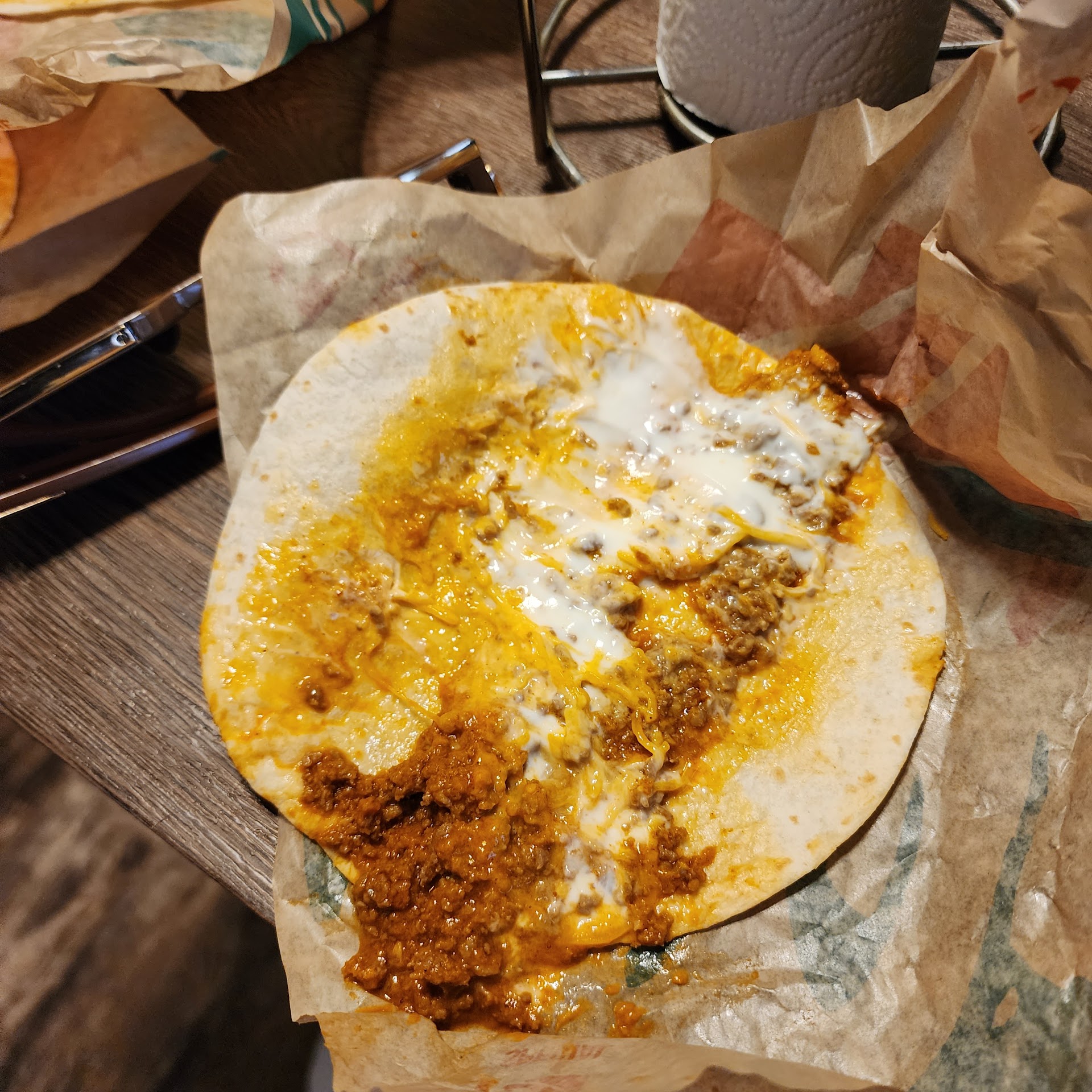 Read moreToday we ordered a nacho box (no pico) and quesoritos-both showing on their local menu. We ended up with nacho bell grande -with tomato and something in a soft shell (not the quesorito as ordered)..... we went back. Now we are told that they don’t have the nacho box any longer (didn’t say this when we ordered)- but they would “create something close” and charged more for the 6 pieces of chicken they put on them. Never did get the quesoritos-we instead got soft shell “somethings”- 2 of the 3 didn’t have meat, one had no rice-supposedly the manager made them himself....not the first time this location has screwed up (I’m sure most don’t take things back).... but it was even worse than before.... no more bell for us unless we are somewhere else in town where they...