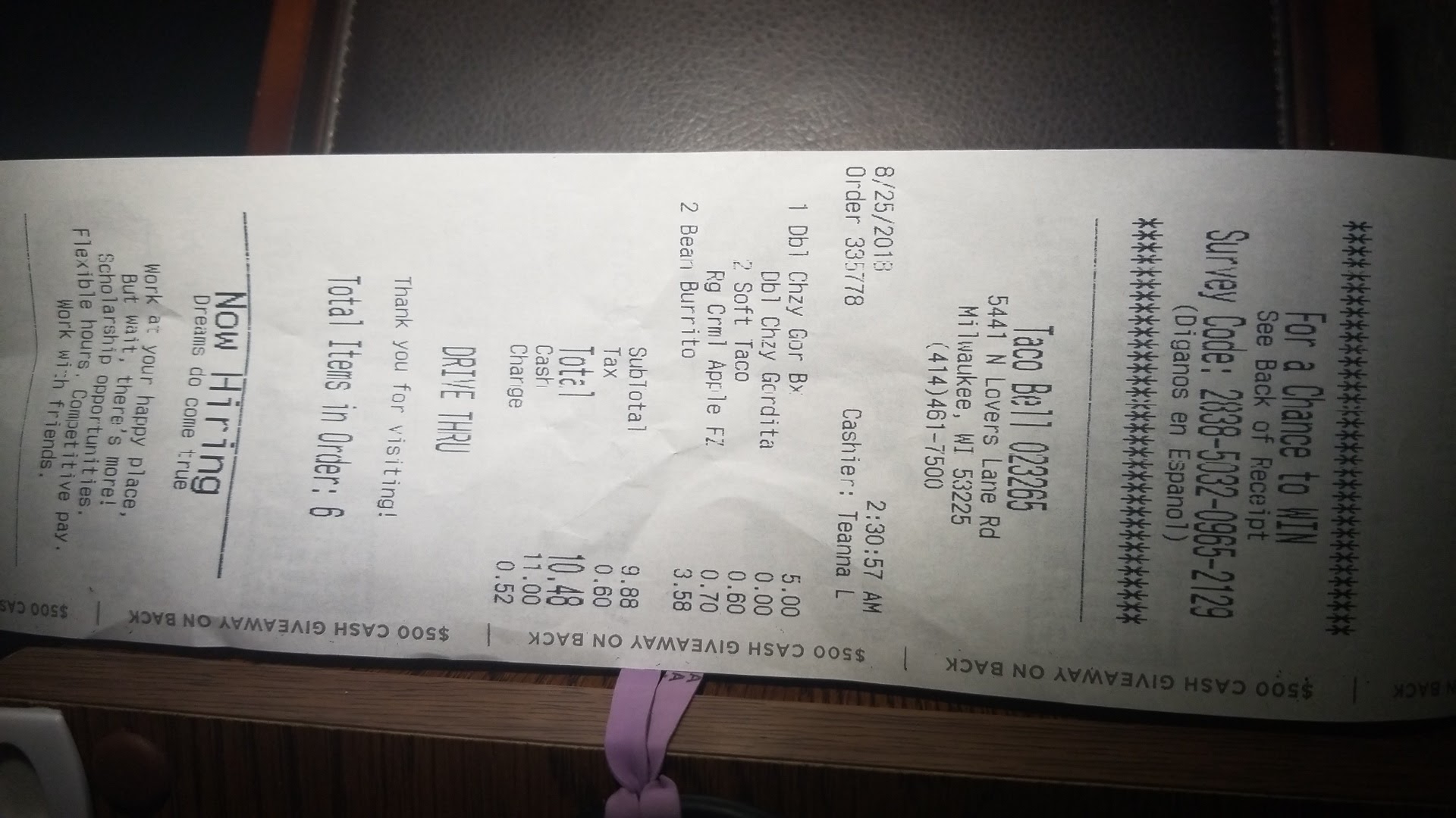Read moreVery unprofessional, people need to be trained in basic customer service etiquette. When someone drives up to the speaker box it's not, "Whatchu want?" It's "Welcome to Taco Bell, may I take your order?" Or some variation, I don't care if you put your own spin on it.