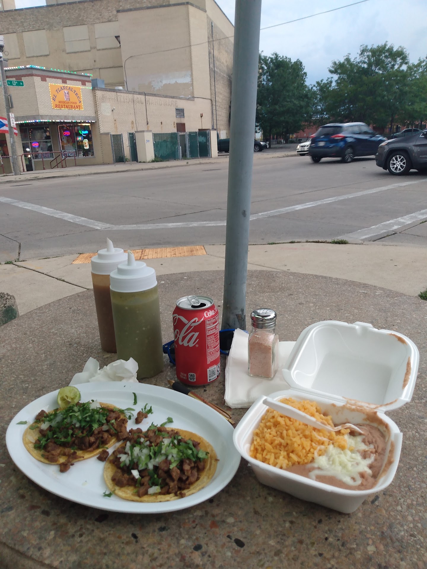 Read moreWe sat outside under the umbrella and watched the crazy drivers and overall traffic of people and cars. The first time there, I thought it was shady because my total was way higher then I expected. I said wait, what?? I said the prices of the three items I ordered but the young male cashier told me, no, the posted prices are "subject to change" which was so shady. So.....they make up prices. The French fries were hot and delicious and not greasy. Absolutely perfect fries and a big portion enough to share. The tacos were hot and fresh and on point. The rice was ok. The beans were better. I liked the outdoor seating and sitting under the umbrella. Interesting especially because that corner is certainly an interesting spot to see the coming and going of...