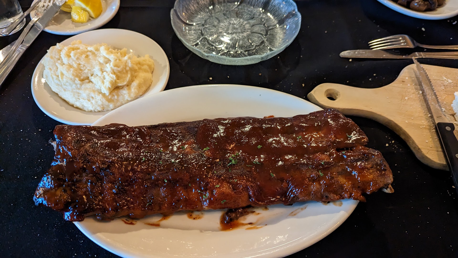 This is the first time ever eating here. Our meals were ok, we had shrimp scampi for an appitizer which was 2 shrimp for $12.00 tasted great but thought the price was way to high. The bread and relish tray outstanding especially if you put the honey on the warm bread. We each had a salad which was again ok not bad not great just a salad nothing stood out about it. I had the Kansas's strip steak with mashed potatoes and gravy, my wife had the larger ribeye with the garlic topping and the fry's. We both ordered Med Rare her steak was cooked really nice a very good med rare, mine was more of a medium and it was dry and tough even for a strip steak is was extra tough. Now for the prices you are paying $60 a steak I expected much better cuts of meat and at a steak houses of this class there should be Chefs that can cook steaks to the correct doneness. The fry's we're fry's good, my mashed potatoes were good but the gravy was very salty kinda ruined the mashed potatoes. For dessert my wife had Tiramisu and I had the Key Lime pie, both again we're ok. The service was outstanding perfect. Now I am judging their steak quality against other Steak Houses we have eaten at ,Five O'clock Club, Rare, Carson's, Butter Inn, Mo's, and Perry's in Chicago. Not sure if we will go back there but they're are several other dishes that looked good, but I know for sure if we go back we will not order steaks. I do realize sometime you can have one inferior cut and maybe that was the one I got, but still the steaks just did not wow...