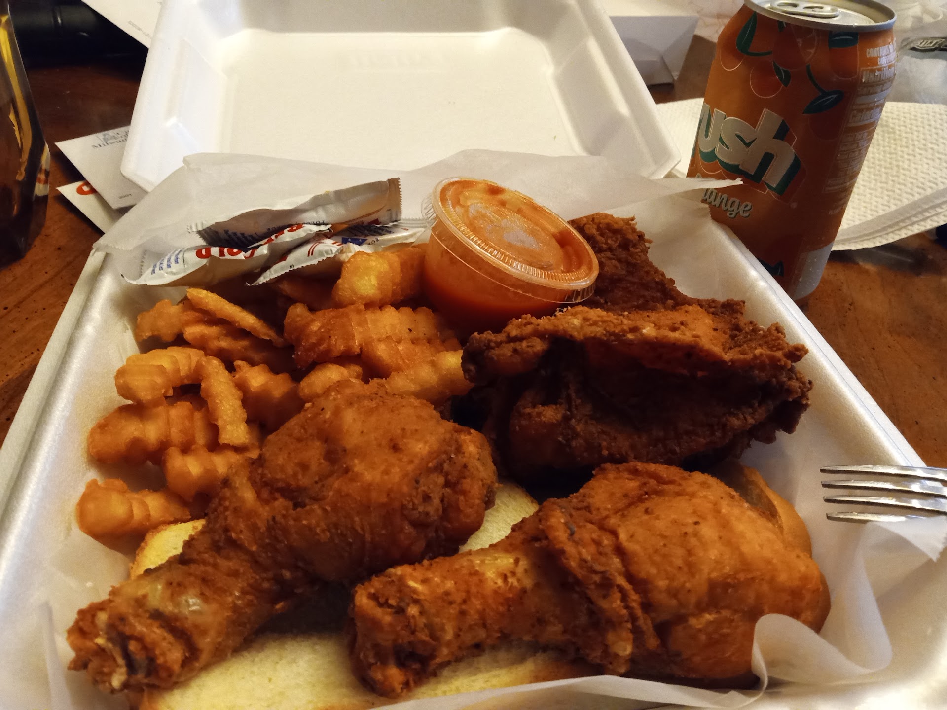 And that's when I knew I was in for something special. I got the 3 piece dark meal (for 11$!), and holy cow, what a treat. Crispy skins, excellent seasoning, and just all around great down home chicken. I'll be...