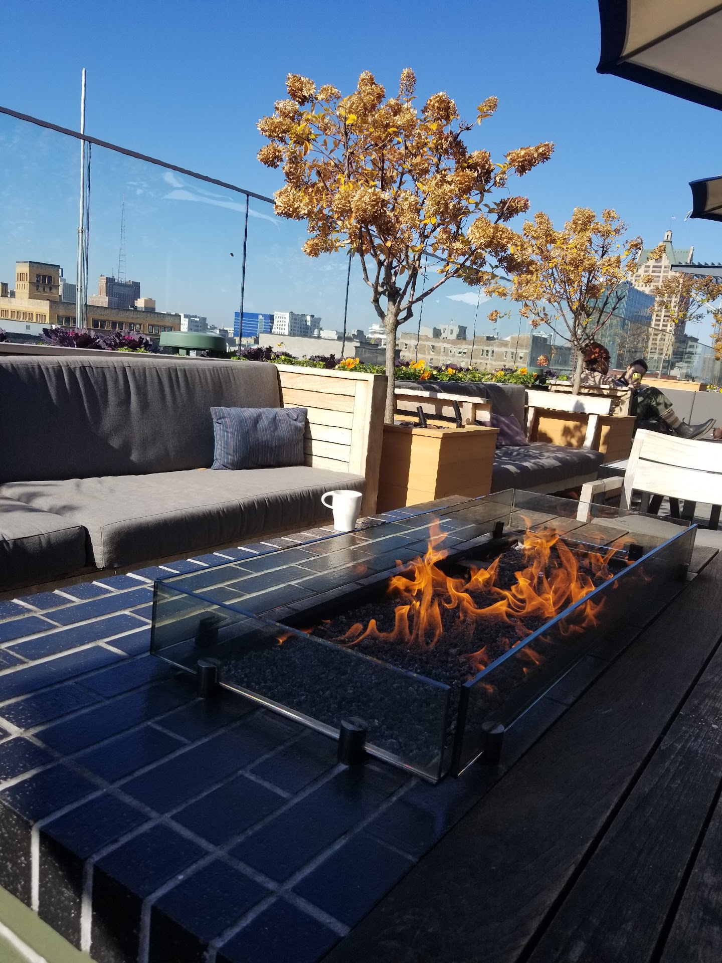 DO NOT GO! The only thing going for this place is the view. The website states that they don't take reservations, and that was ok prior to our arrival. When we got there a person at the entrance said there was a 30 minute wait and that was fine since the downstairs lobby had a nice seating area. We actually were texted to come up to the 9th Floor in 10 minutes vs the 30 minute time frame we were originally given. Awesome. We get to the entrance and our party of six was stopped. They weren't able to come in. We were never asked how large our party would be. I was only asked my name and number and that it would be around 30 minutes. Ok, first DING! Our party of six eventually made it through to the outside of the venue. Very busy. Thinking to myself this is a good thing. Nope! We couldn't find an area to sit or stand. All of these beautiful pit sets for seating 10 or more guests were occupied by two people sometimes four people. I'm not afraid to ask some to move over a bit, but you surely take on the chance of getting the stank eye or straight out told, "NO"! I think there should be a host/ hostess seating people based on their party size, so...second DING right there. Moving forward, we found a high top table which had room for four and had to ask our neighbors if we could take their chairs. Again, we were a party of six. Now, back to this table that was available. Dirty, filthy dirty. So sticky and filled with dishes from the prior patrons. I was beginning to think a public park bench with bird droppings would have been a better choice for the evening... obviously the third DING! When we finally got a waitress after about five minutes of sitting at a sticky table with someone else's dirty dishes. She was so nice, although we did have to ask her twice if she would wipe the table down for us. Since she really couldn't reach all angles because again, our party of six was shoved in at a four person table. She handed me the towel to wipe down the table...OMG! That was the fourth DING! When we finally got our drinks after awhile, everybody seemed happy until I touched my glass and my hand stuck to it. It hadn't been washed. I held it up to the light and it certainly wasn't even attempted to be washed. HUGE fifth DING! I mean HUGE! One, the bartender should have noticed that when he gave the waitress the drink, and two the waitress should have felt and noticed the sticky grossness while handing it to me. As a waitress what you are giving your guests should be examined before you serve it. Her tips might be healthier if she followed that mindset, but of course the gratuity is already included when your party has six or more. So why even try to look things over? Four out of our group of six were asked if we wanted to order food, the other two were left out...never asked...Ding six! When someone in our group mentioned this to her, she did apologize. That was truly nice of her. So the two that were left out ordered fries because it was getting late and the kitchen was about to close. They were given super cold fries...the seventh DING! We had her take them back to the kitchen and remove them from the bill. Here's the kicker!!! The drinks range from $15-$18 per their menu. They don't mention that if you order your drink with Coke or mixer it's another $5 added on. Maybe I am naive to this charging system, but seriously I think that is so wrong. One person in our group ordered the same drink three times and each drink came out looking shorter and shorter. I know drinks are measured out, but be consistent with the drinks aesthetics. When I returned the drink to our waitress at the bar she proceeded to tell me each glass was different in size. Again, be consistent so customers don't think they are getting ripped off. I compared my glass to the glass she said was, "different" and I asked her where the difference was, she came back at me with this response, " I can put more ice in your glass to make it look fuller". I'm going to give that a DOUBLE DINGER! Now that has brought my gripes up to nine dingers. So I...