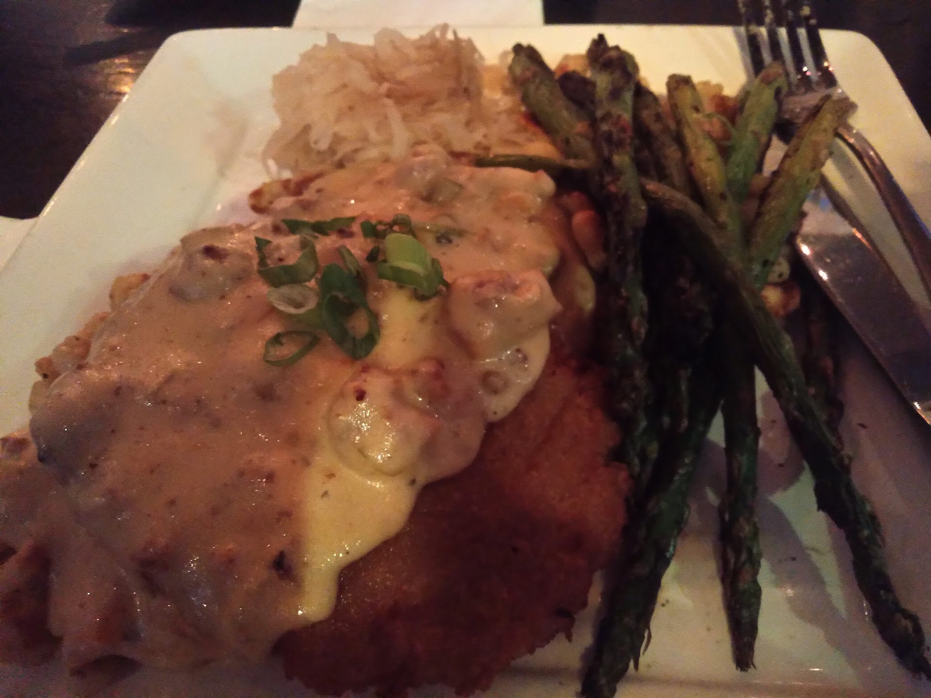 For dinner I chose the Jaegerschnitzel. The description made this dish sound wonderfully flavorful so I was really looking forward to it. Unfortunately, had there not been sauerkraut on the plate, there would not have been any flavor at all. Major disappointment.