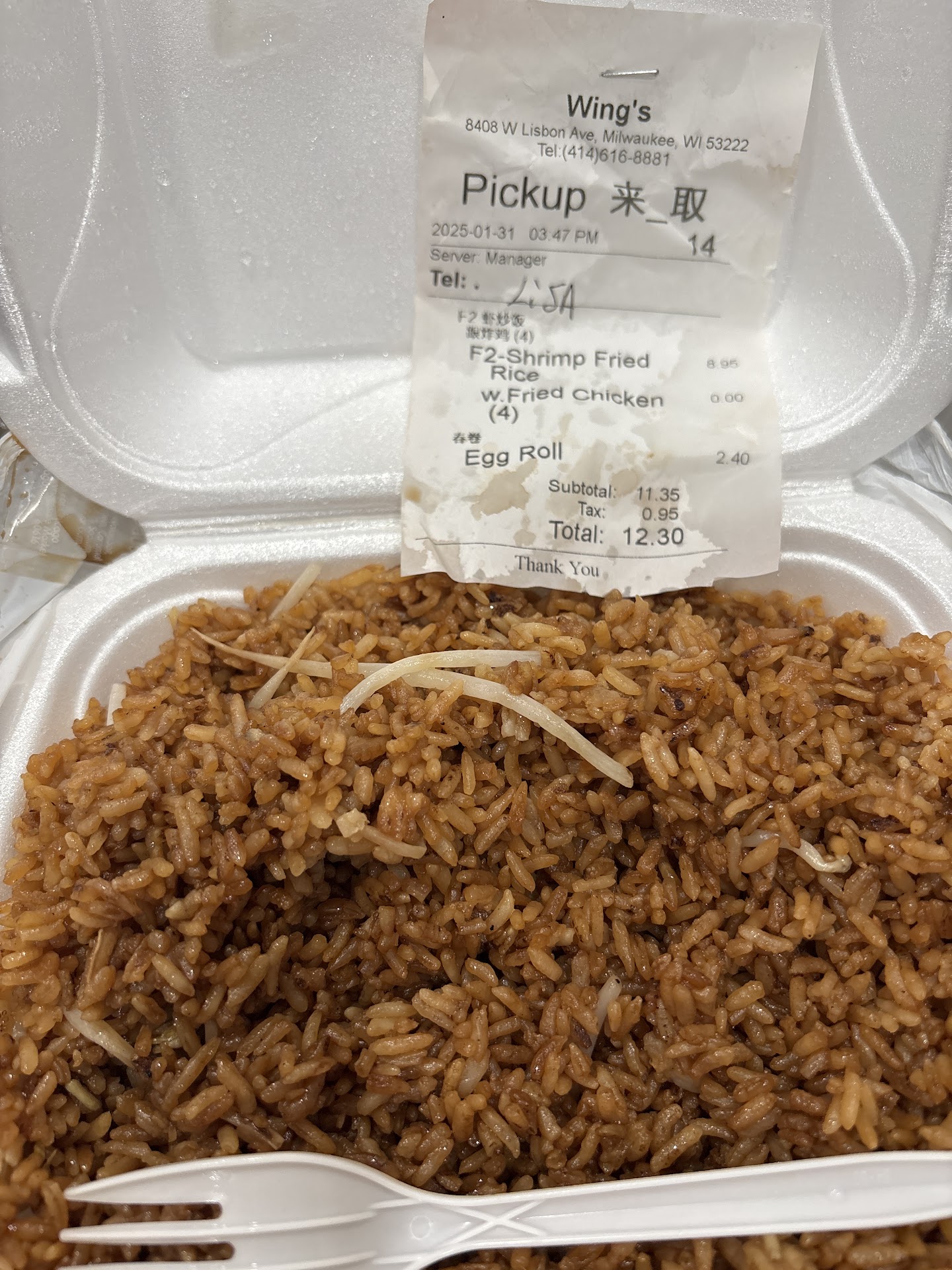 Read moreWe have been going there sine 1995. New ownership this year with more hours, menu, and price increases. We were happy to give it a try on Good Friday and were not swayed with the price increase. We hoped the recipe staples still existed however it did not. Our order was over $110 for at least 8 items - not a problem as the containers were jam packed like before. We ordered 2 shrimp fried rice, beef and broccoli, 2 szechuan shrimp, and vegetable egg foo young. Some of this order was going to my 90 year old Mom in Waukesha - she loved the old Wing's - especially the shrimp friend rice and egg foo young!