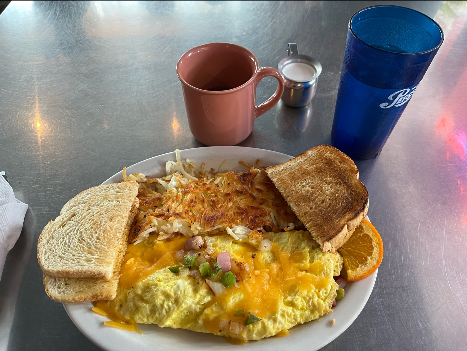 Ordered the western omelette hash browns with sour dough toast) with decaf coffee and water. Hugh portions of very good food. If you love the butter from crust to crust you'll love breakfast here. Coffee was strong and bold with fresh creamer pitcher for each table.